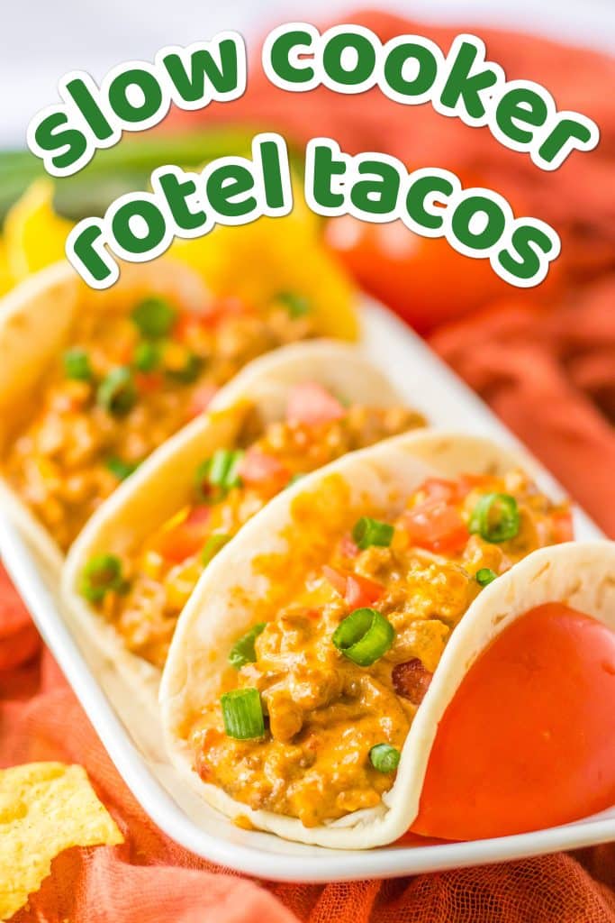 These Slow Cooker Rotel Tacos are going to be your new go-to crowd-pleasing, family-friendly dinner! Rotel tacos are going viral right now so I decided to make them in the slow cooker and they come out amazing! Ground beef, taco seasoning, velvetta cheese and rotel tomatoes make up these delicious tacos that you can top any way you want. Just 5 ingredients is all you need to make these!