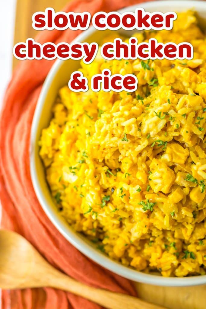 This Slow Cooker Cheesy Chicken and Rice is a staple at my house! Tender chicken, flavorful rice and corn all in a creamy, cheesy sauce. Just 6 ingredients and a few seasonings and you will have a family friendly dinner that is sure to be a hit.