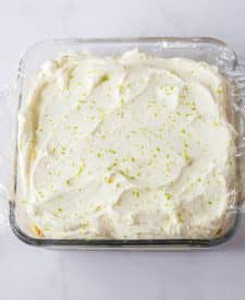 - Spread the whipped topping on the top of the cake and garnish with lime zest and lime slices if desired.