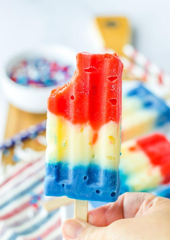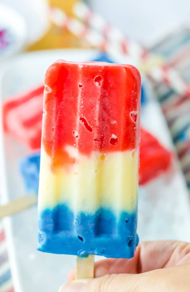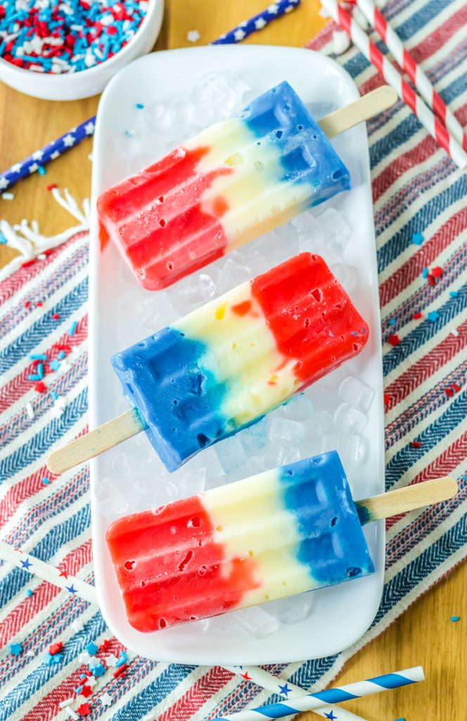 These Red, White, Blue Pudding Pops are going to be perfect this summer! White chocolate pudding is mixed with red and blue coloring to create these colorful layers. A quick freeze and you will have a delicious, creamy, festive pop that everyone will love! These are so easy to make and kids love them!