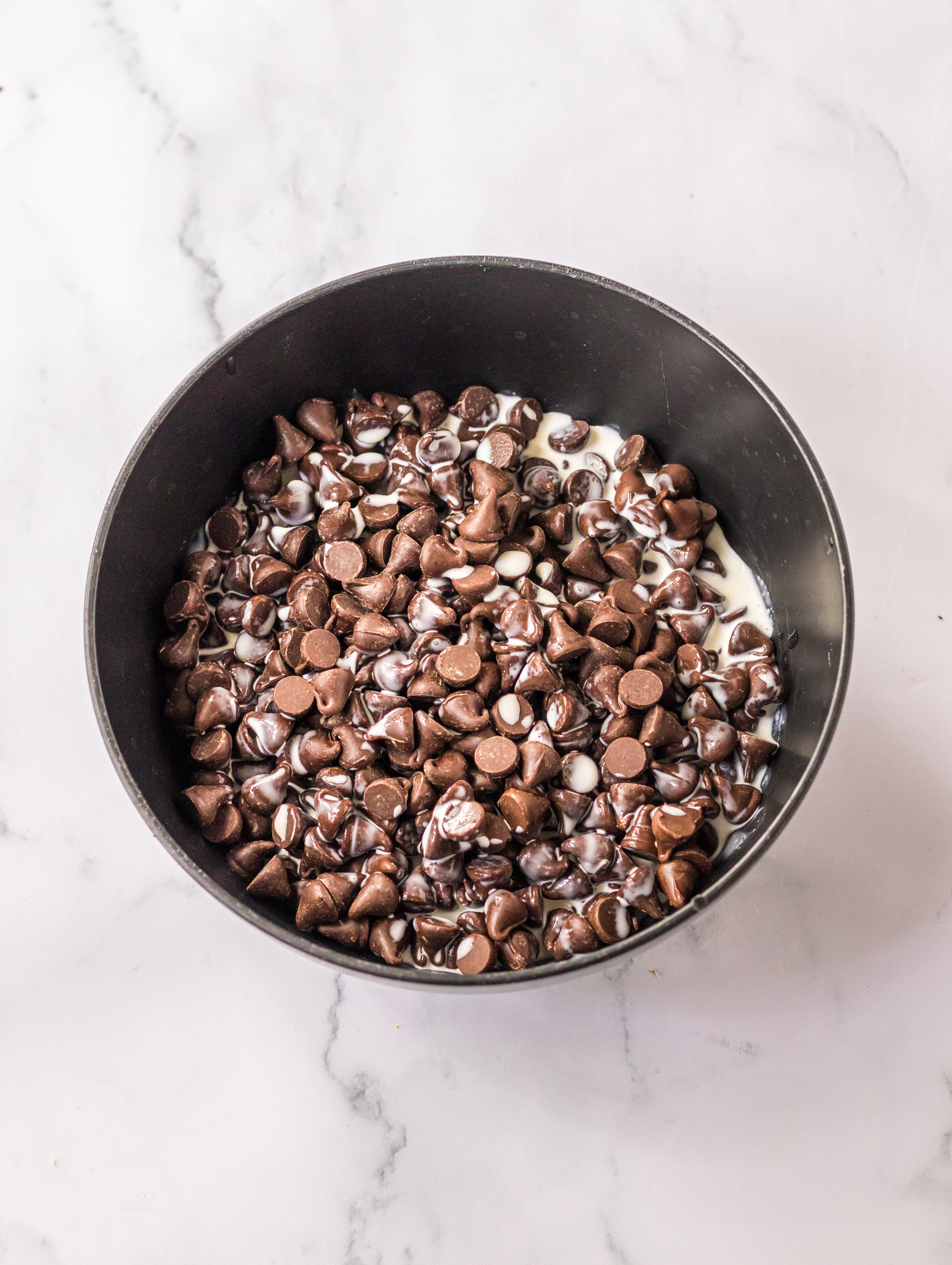 - To make the chocolate ganache for topping in a microwave safe bowl combine your chocolate chips and heavy cream.