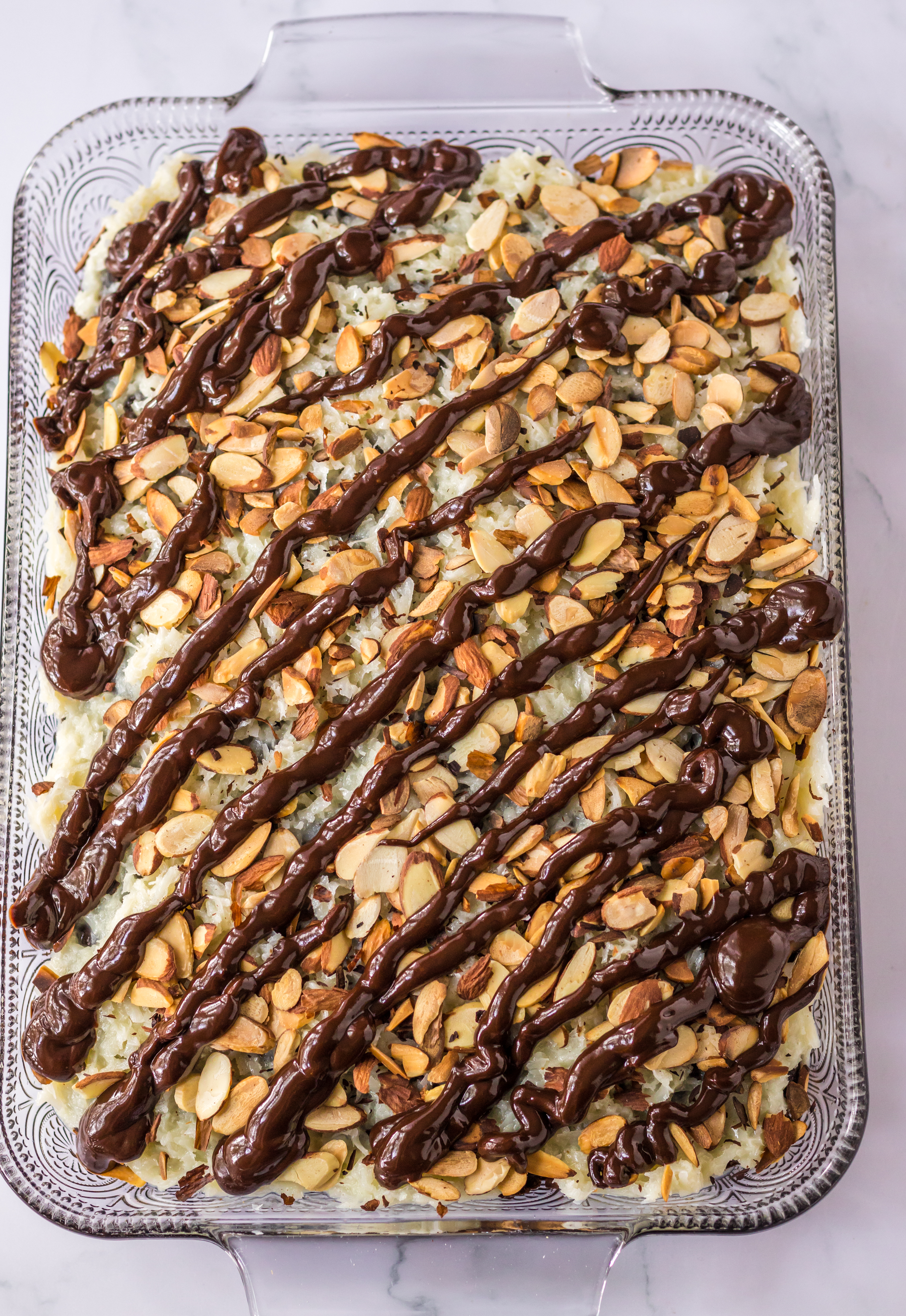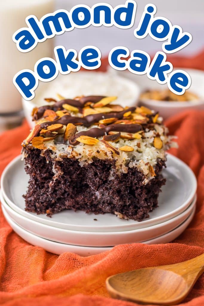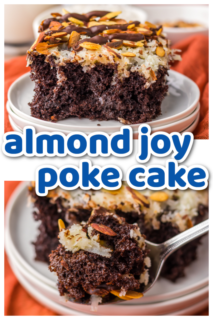 Everyone loves poke cakes and this Almond Joy one is fabulous and easy. A rich chocolate cake gets poked and a luscious coconut sweetened condensed milk mixture gets poured over the top to sink into the cake and make it super moist. The shredded coconut sits on top and get a sprinkle of toasted almonds and drizzle of chocolate. This cake is divine and always a hit.