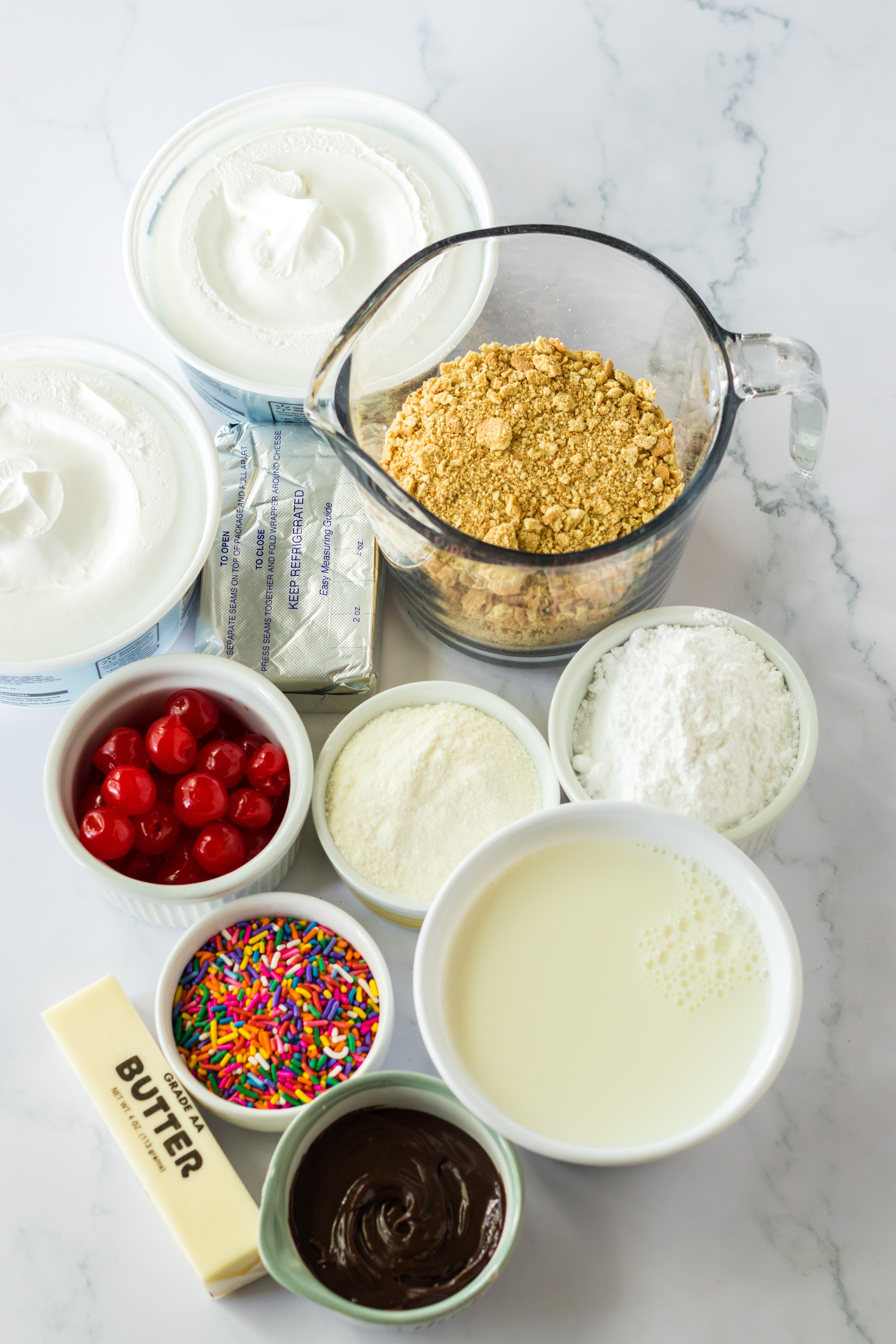 ● Hot fudge, sprinkles, maraschino cherries- All the best toppings for this banana split cake.