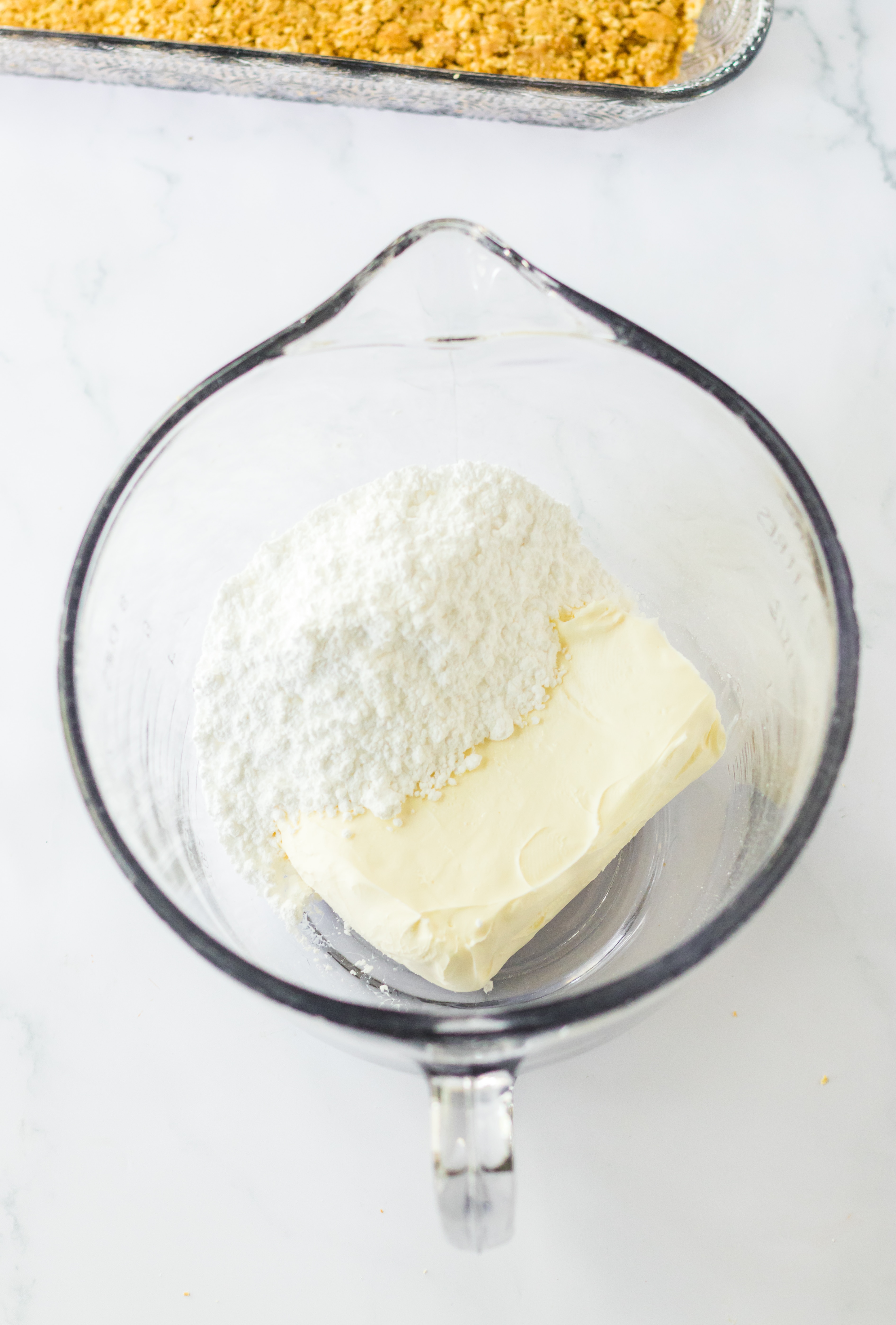 - Press the cookie crumbs into the bottom of a glass baking dish.