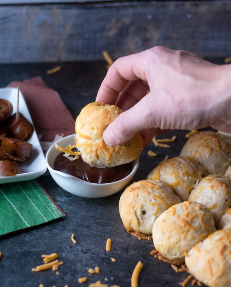 I just separate some biscuit dough, spread with my favorite BBQ sauce, a little cheddar cheese, a Caramelized Onion Meatball and close it all up.