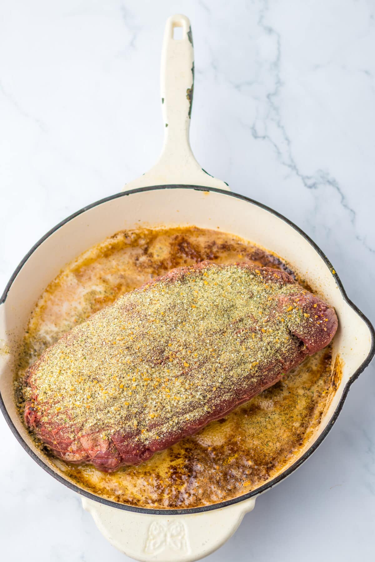 - In an oven proof skillet over medium highheat add the butter and sear the beef on both sides for about 2-3 minutes per side until brown.