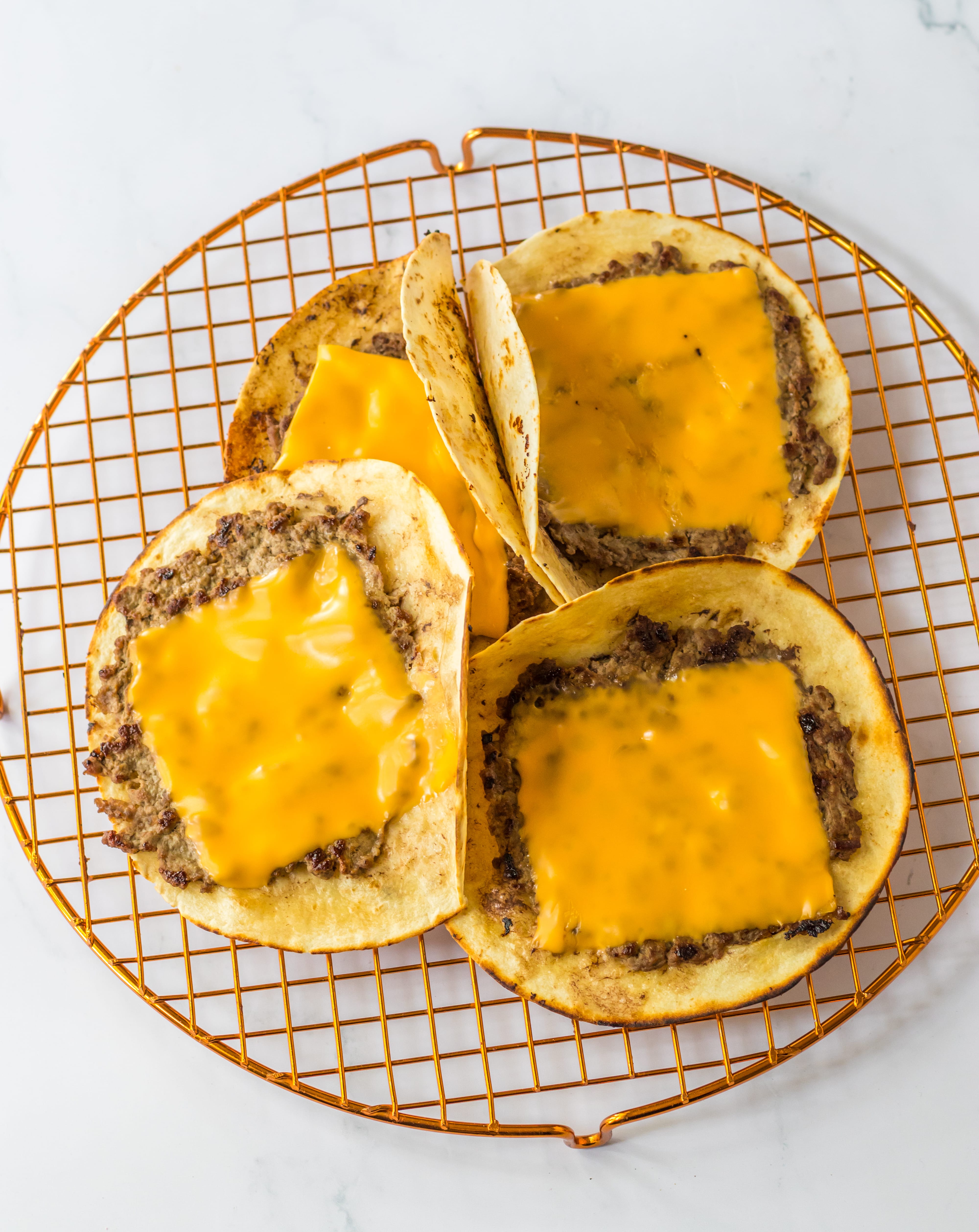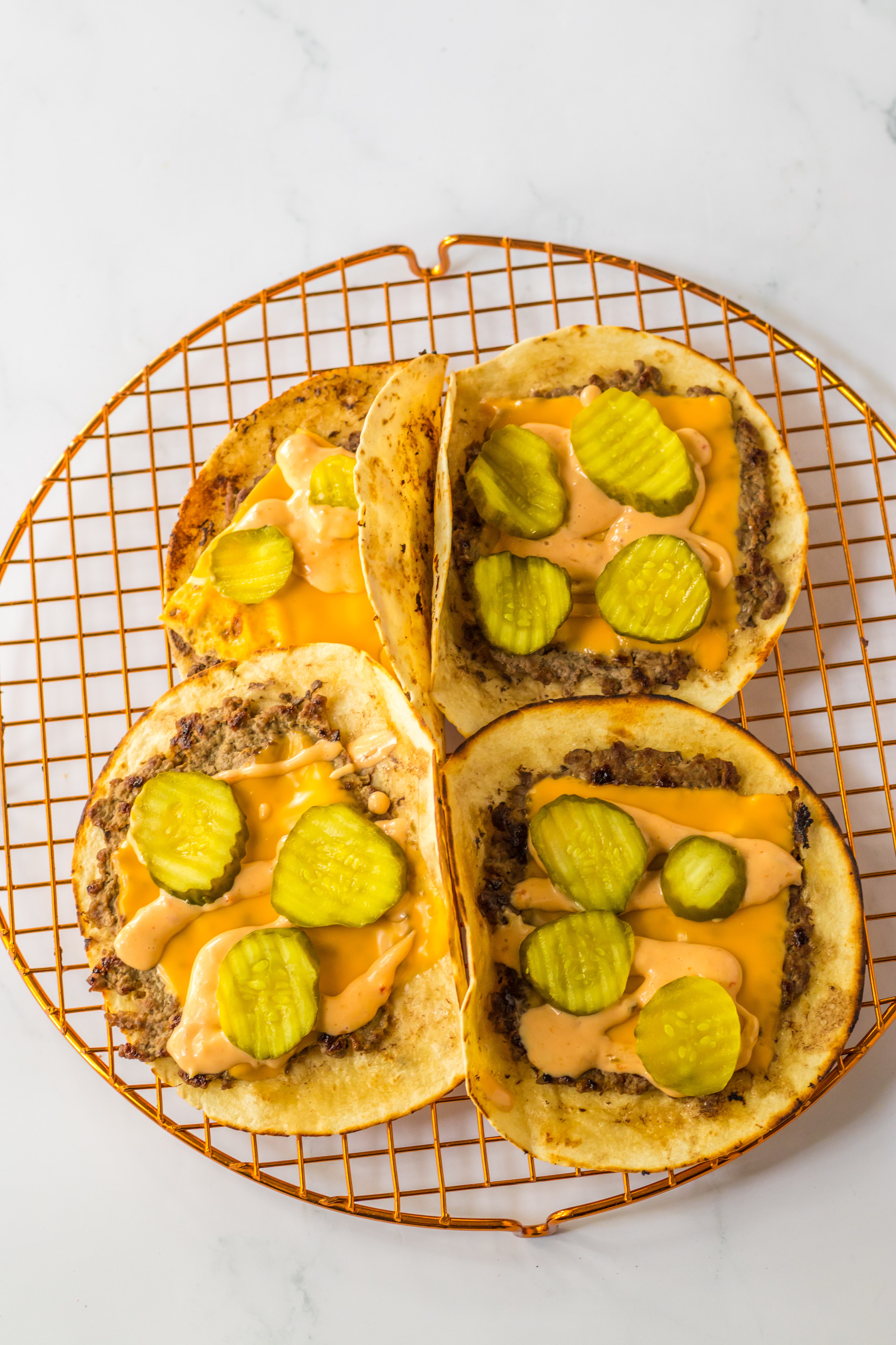 You spread the beef right on the tortillas and cook them in a pan and the beef cooks right onto the tortilla. Then top it with a slice of American cheese, shredded lettuce, diced onion, pickles and that special sauce. These are such a great spin on tacos and burgers!