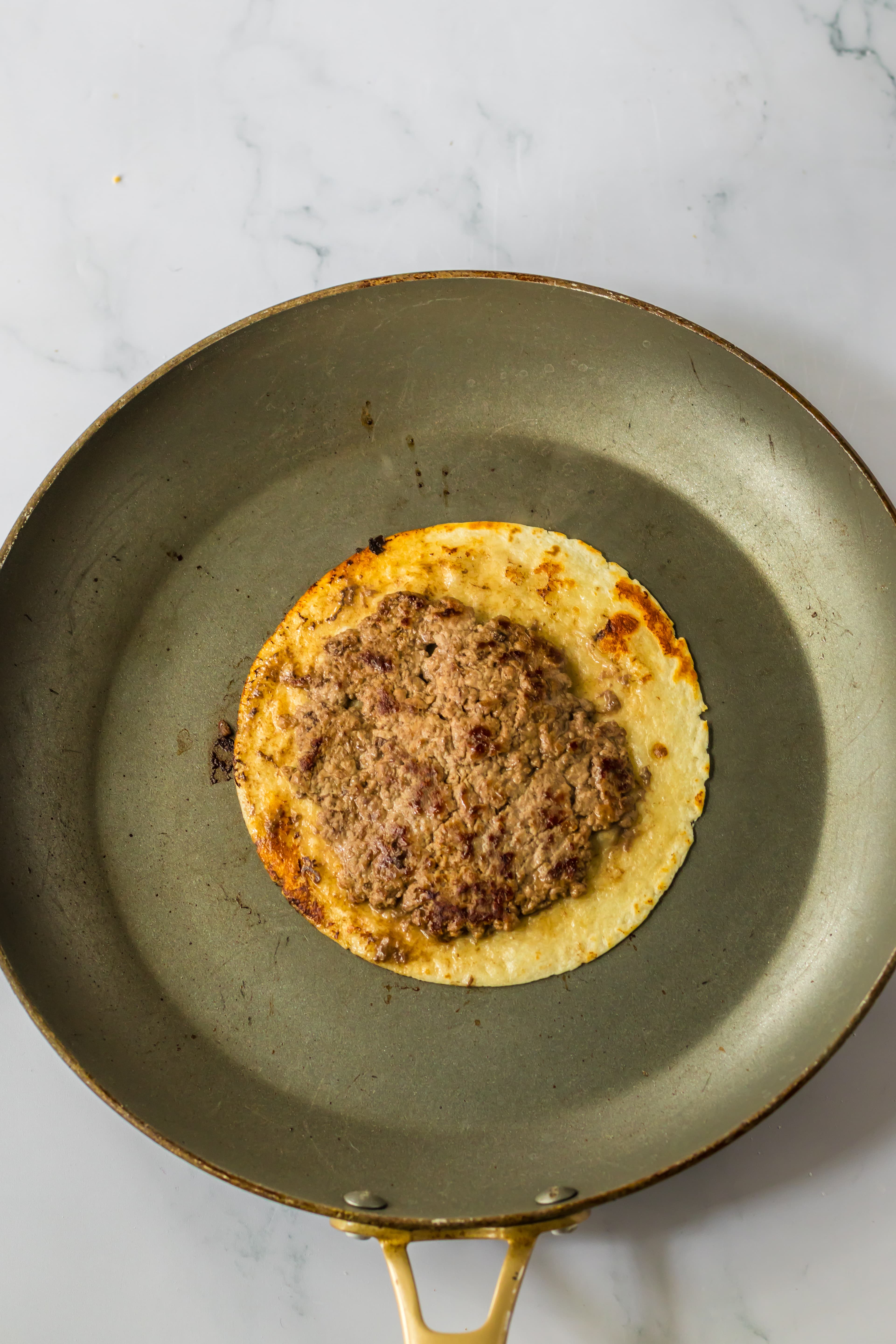 5. Place on of the tortillas beef side down in the pan.