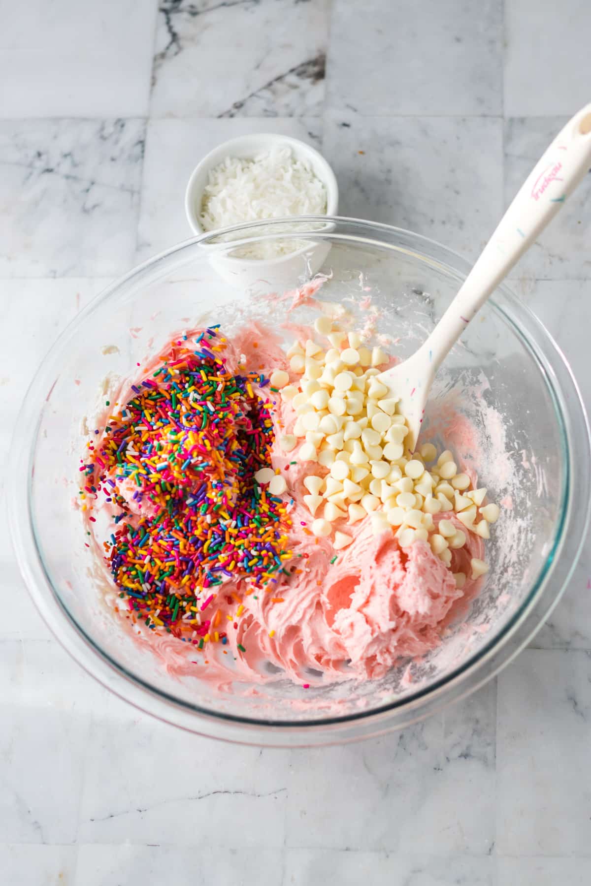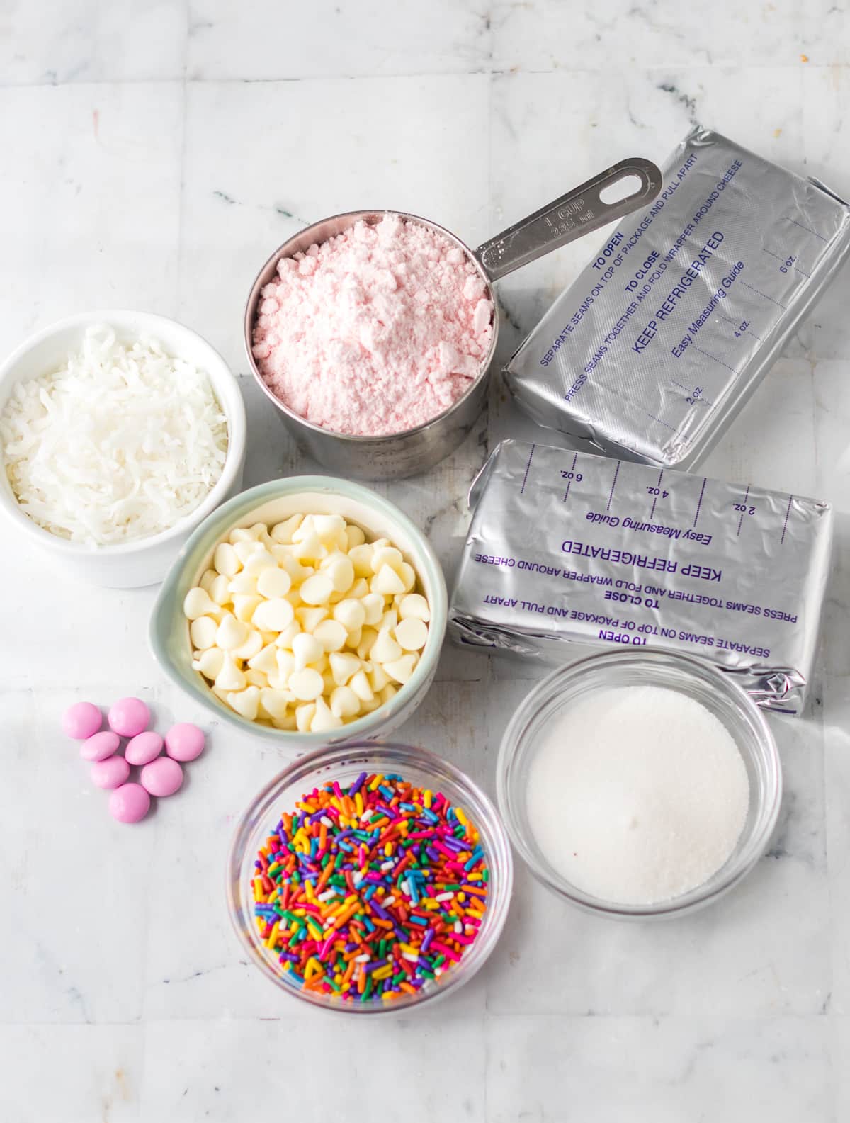 - Strawberry cake mix- You can use any flavor you like, I like the strawberry because it’s such a cute color. You can also use a funfetti cake mix.