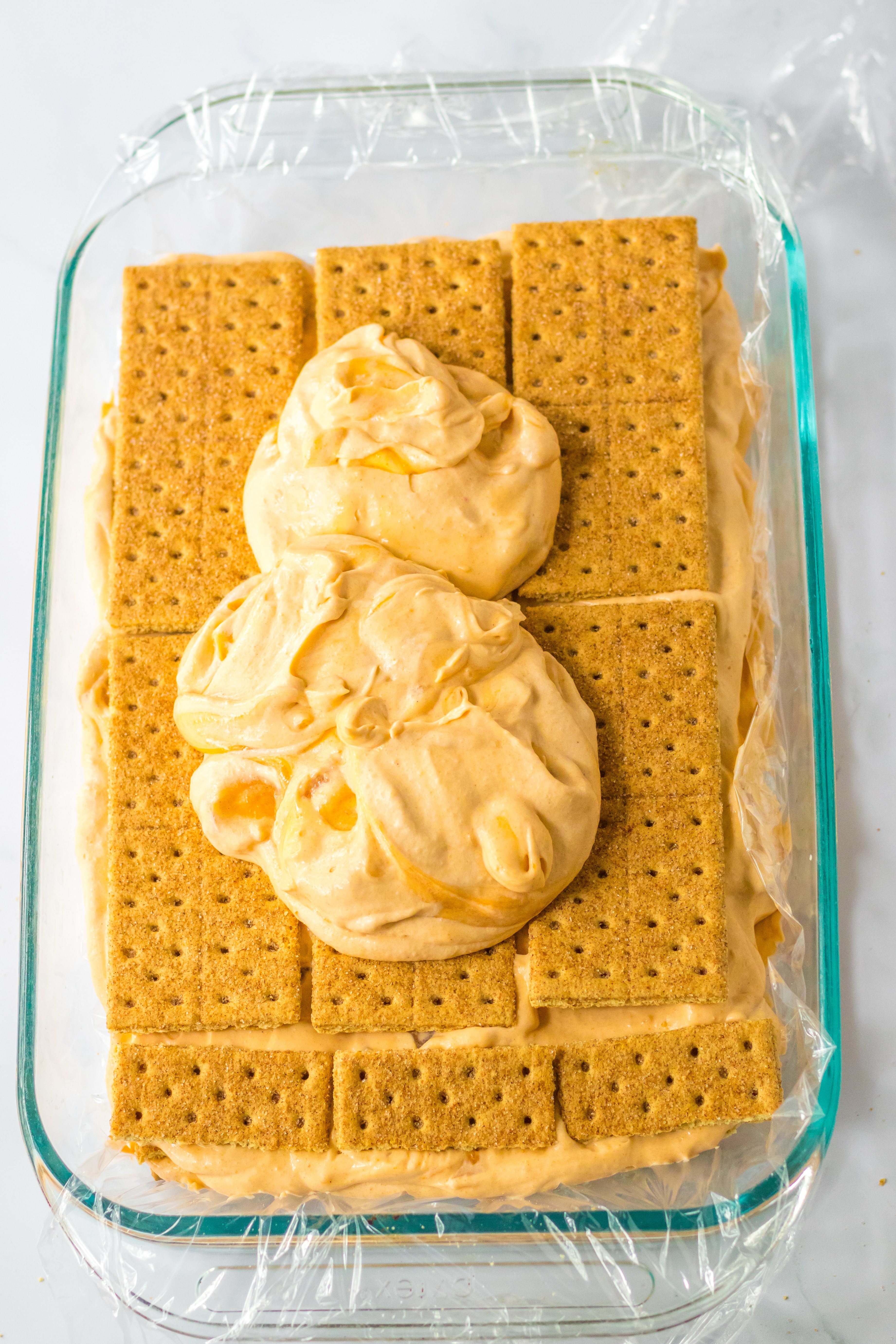 - Repeat with a layer of graham crackers, another third of the filling, another layer of graham crackers and the remaining filling.