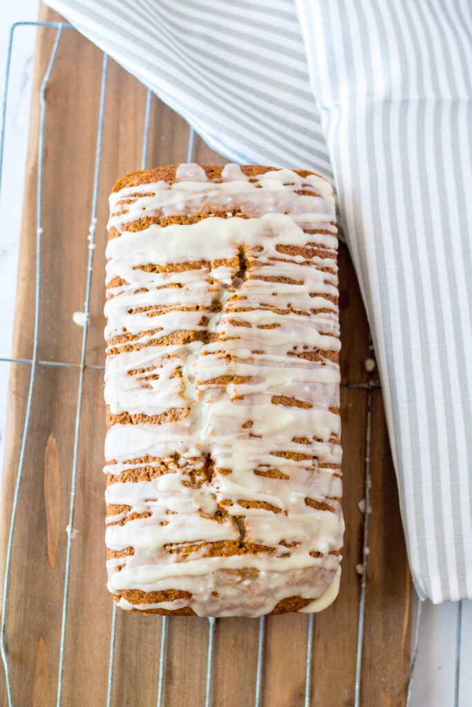4. In small bowl, stir together powdered sugar and Chai Tea. Drizzle the glaze all of over the top of the loaf.