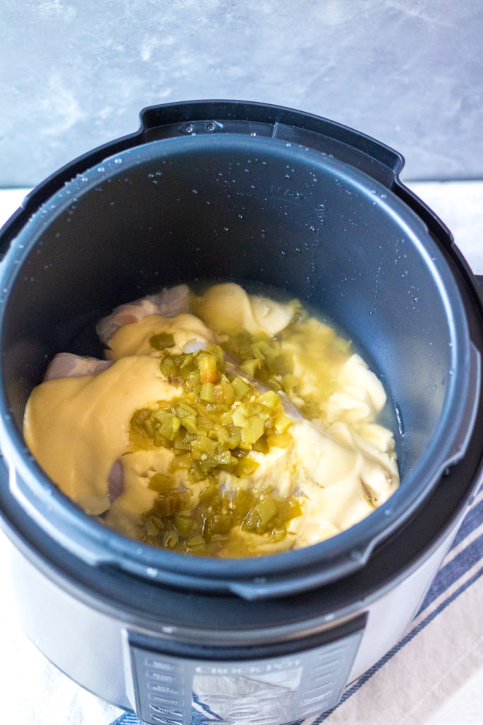 I pressure cook the chicken and cream of chicken with the green chiles and then shred it up (I use a hand mixer to make this even faster!)