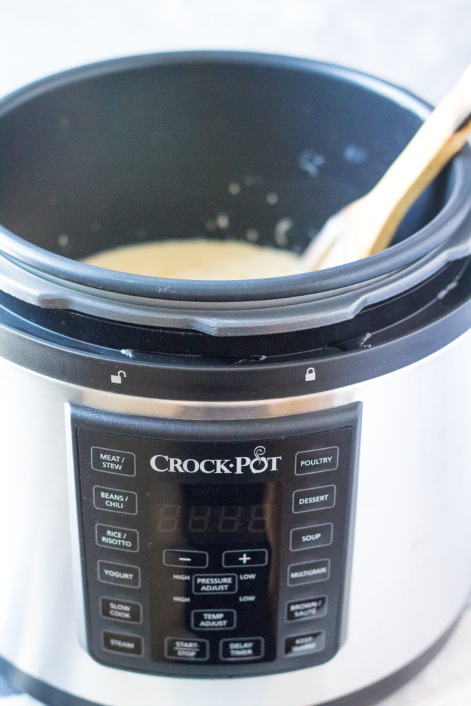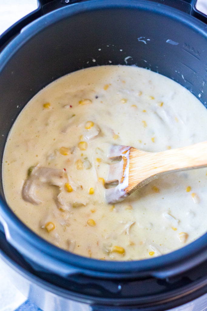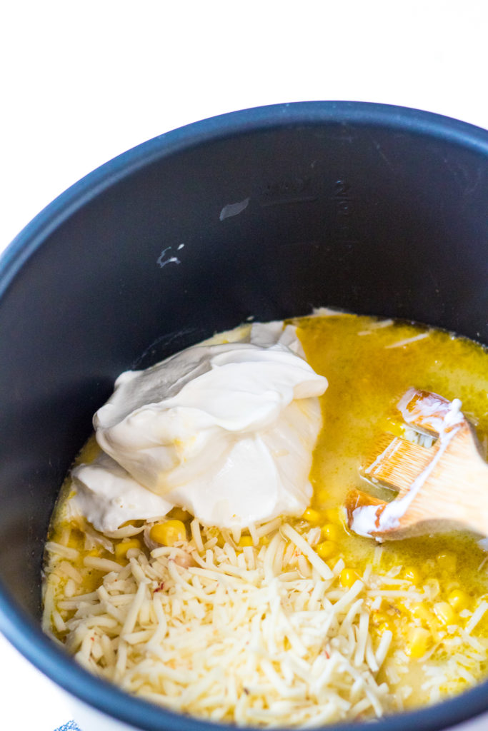 Then I add in the sour cream, corn and pepper-jack cheese and use the saute feature to ensure all the cheese melts.
