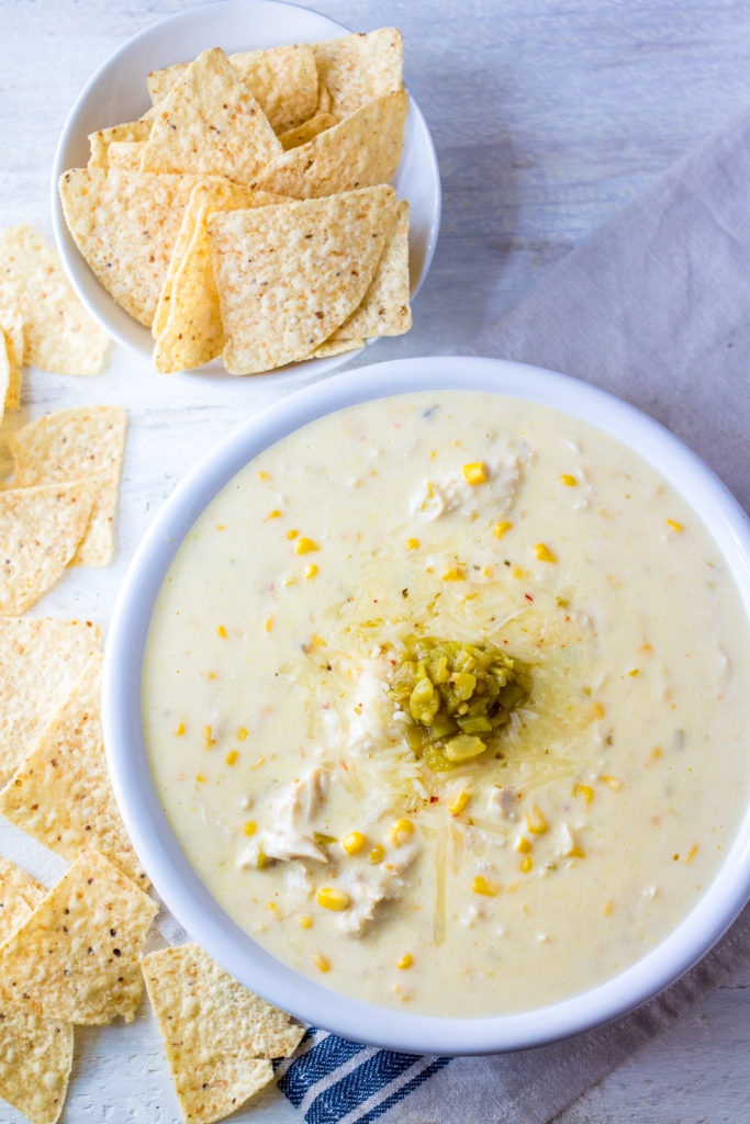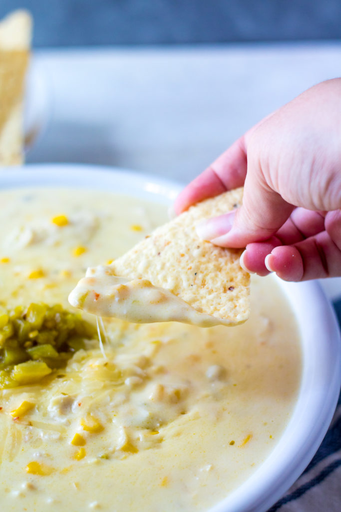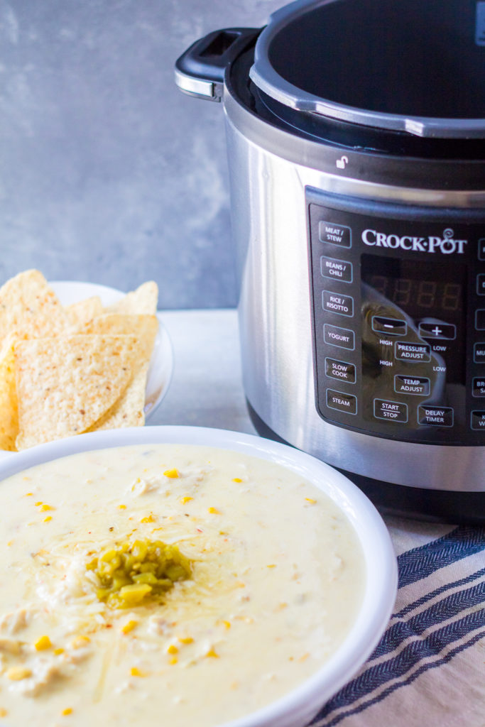 Cheesy Green Chile Chicken Corn Dip is a summer staple! Perfect in the pressure cooker, it comes together in minutes! Flavorful and cheesy, it is a favorite
