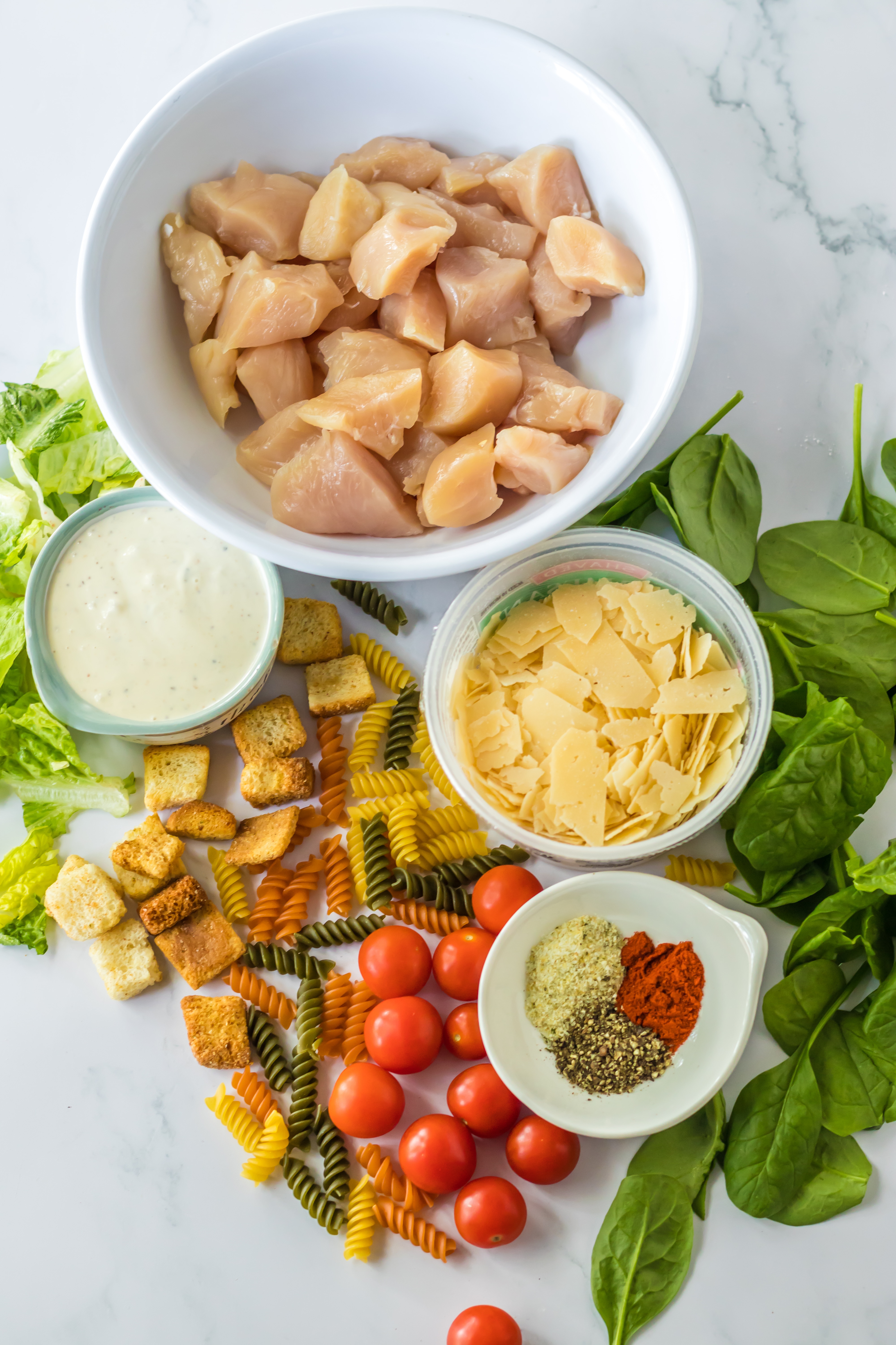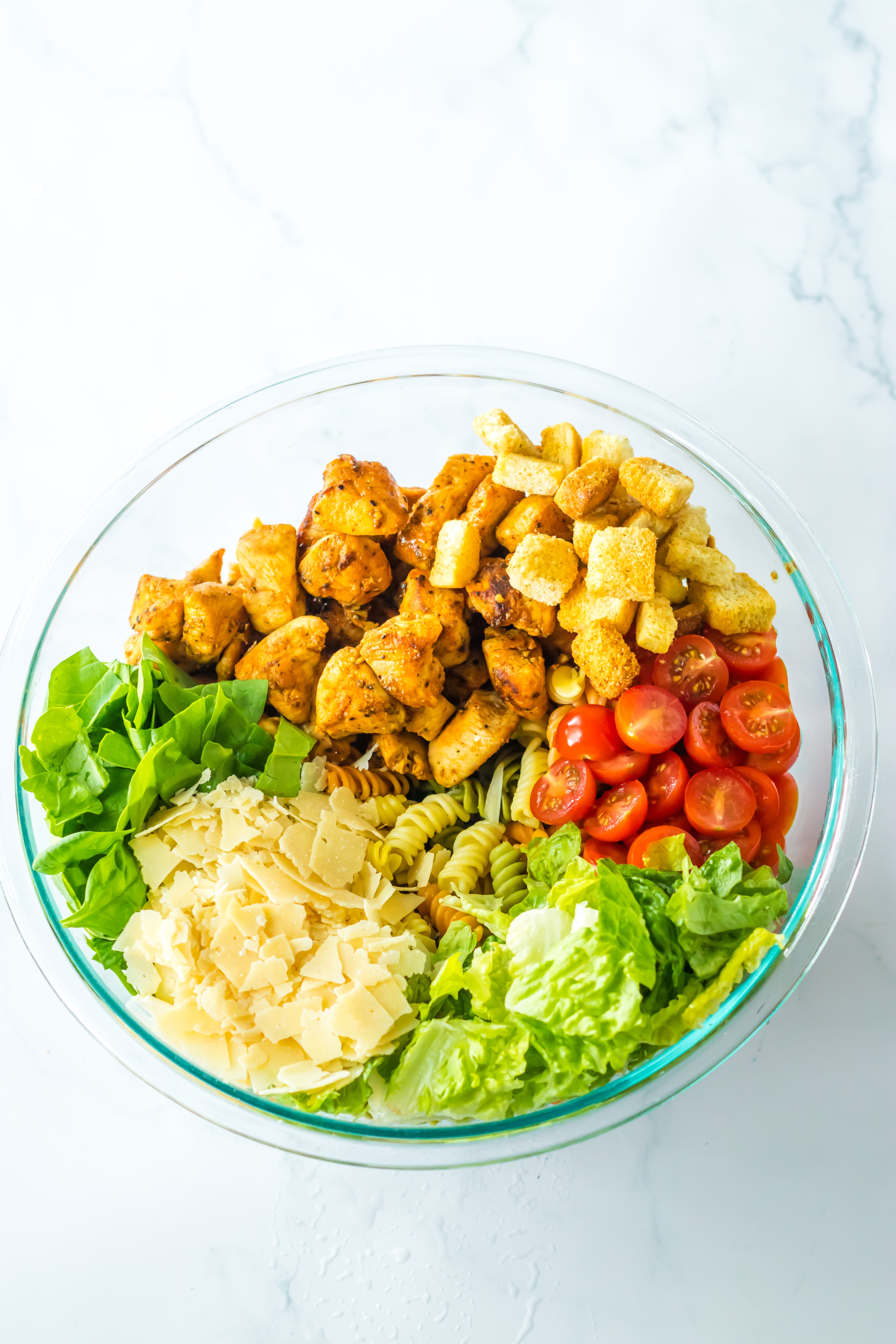 - To a large bowl add the pasta, chicken, tomatoes, romaine, spinach, parmesan cheese, and croutons.