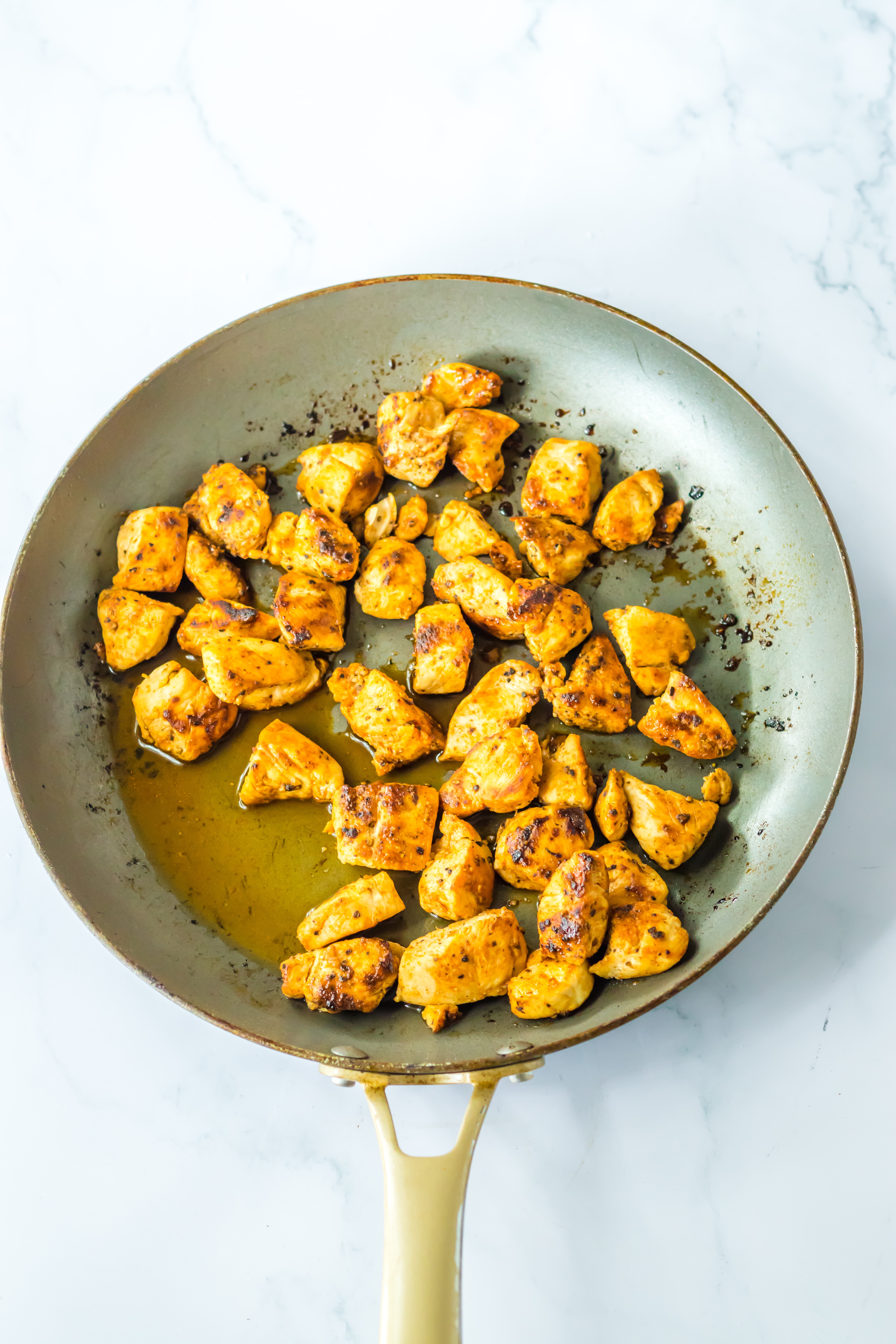 - In a medium skillet over medium-high heat, heat the chicken until browned and cooked through.