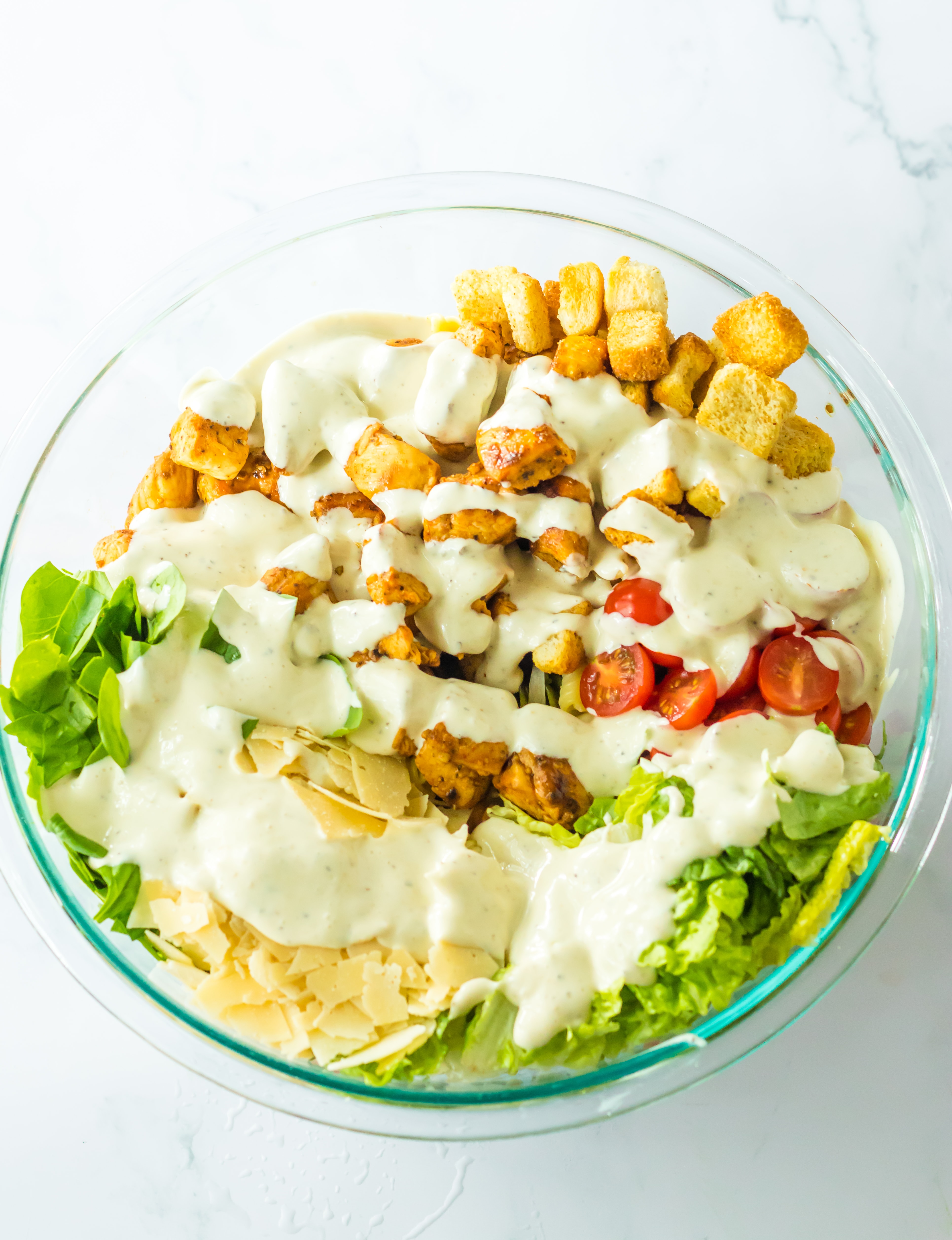 - Caesar salad dressing – Use a good quality brand. You can make homemade dressing but I just usestore-bought dressing.
