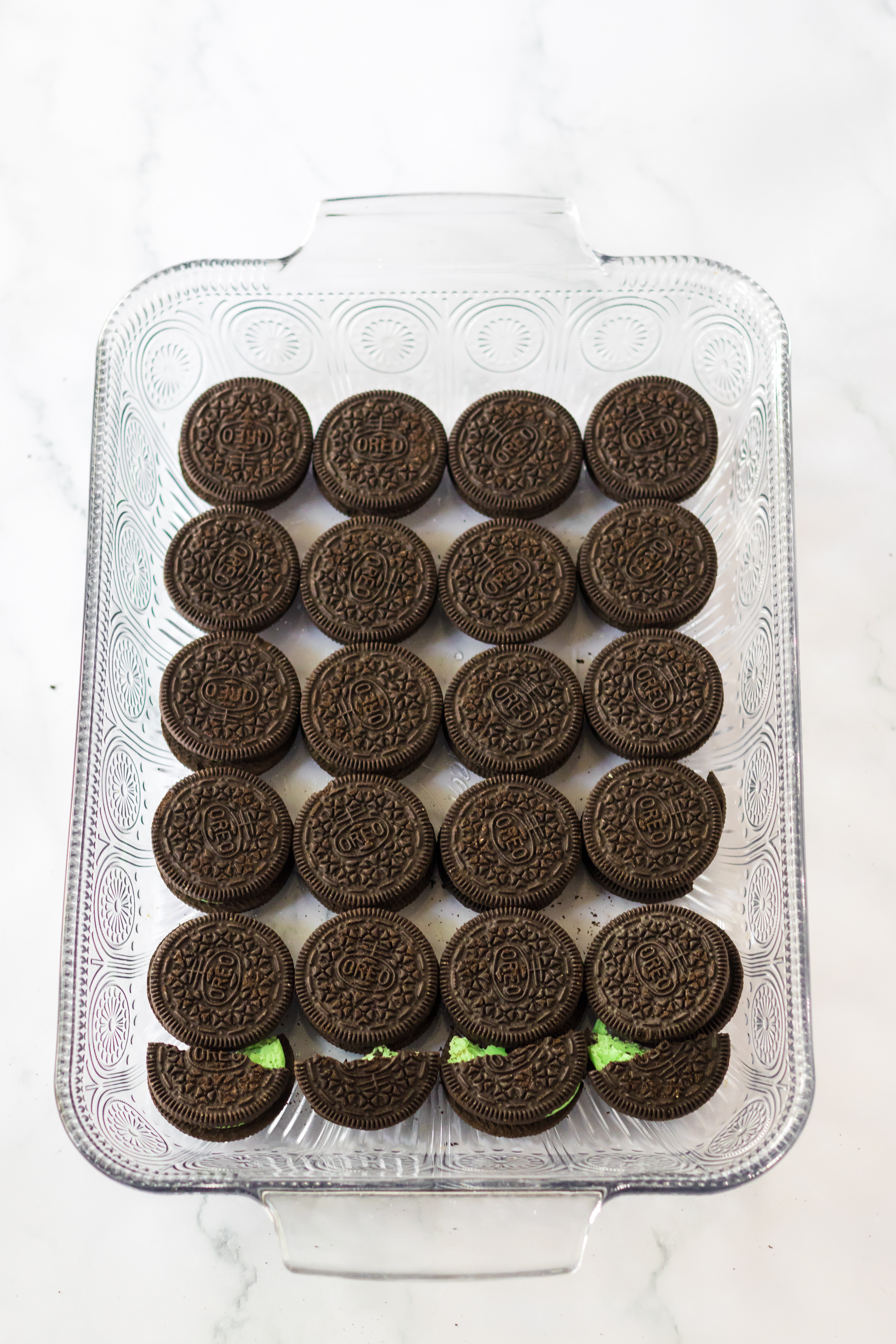 - In the bottom of a 9×13 baking dish lay the oreos in a single layer, you may need to break the oreos for the end row.