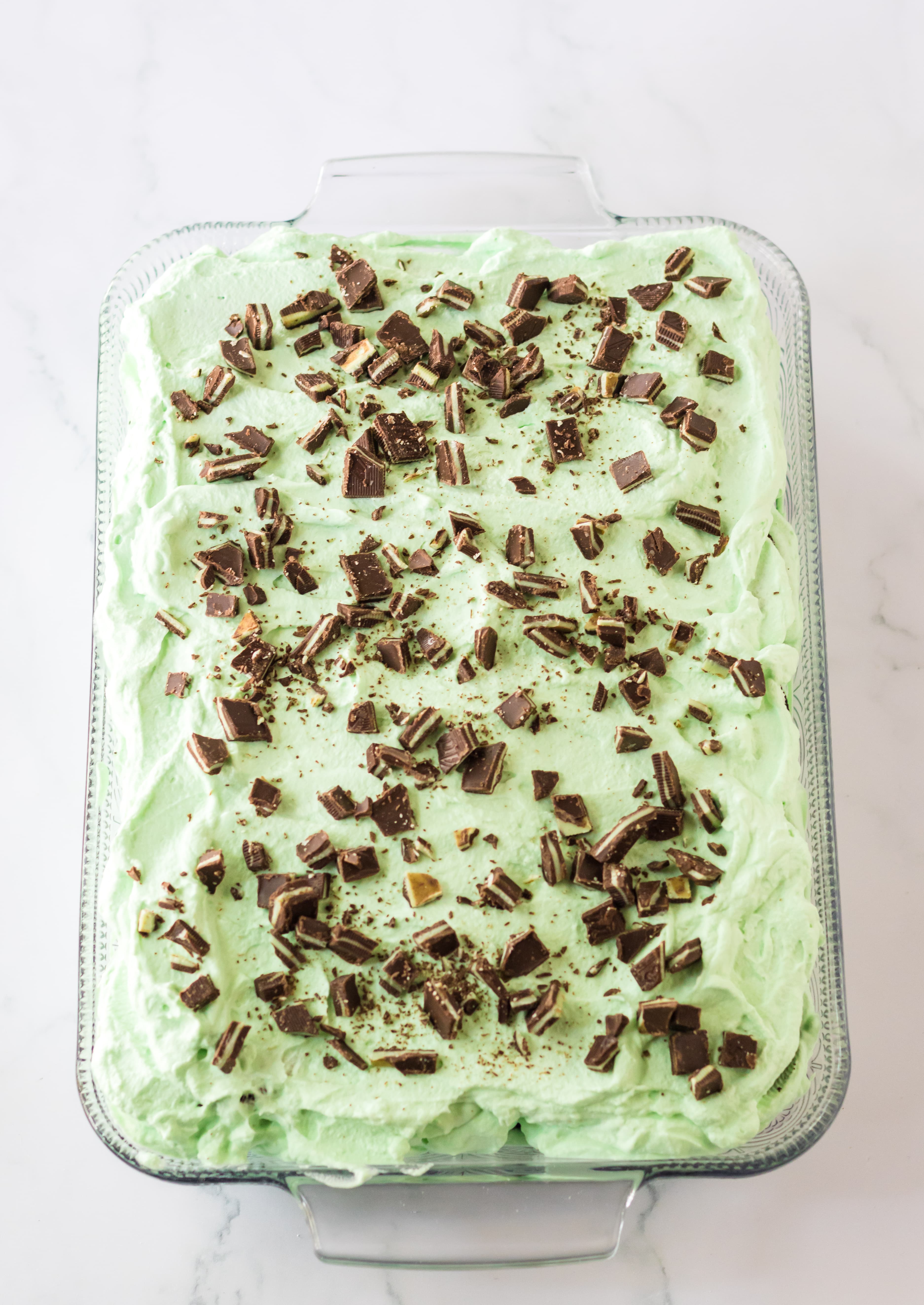 This version is perfect for summer. Mint cream layers with oreo cookies for a fabulous dessert. The whole thing chills overnight so the cookies get nice and soft like little layers of cake. Then you slice it and serve!!