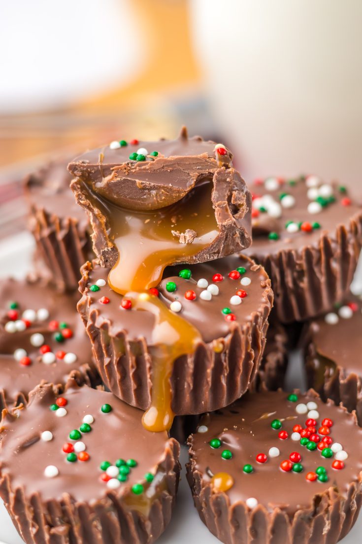 These caramel cups start with a chocolate base, an easy, luscious caramel filling and topped with more chocolate and the cutest holiday sprinkles.