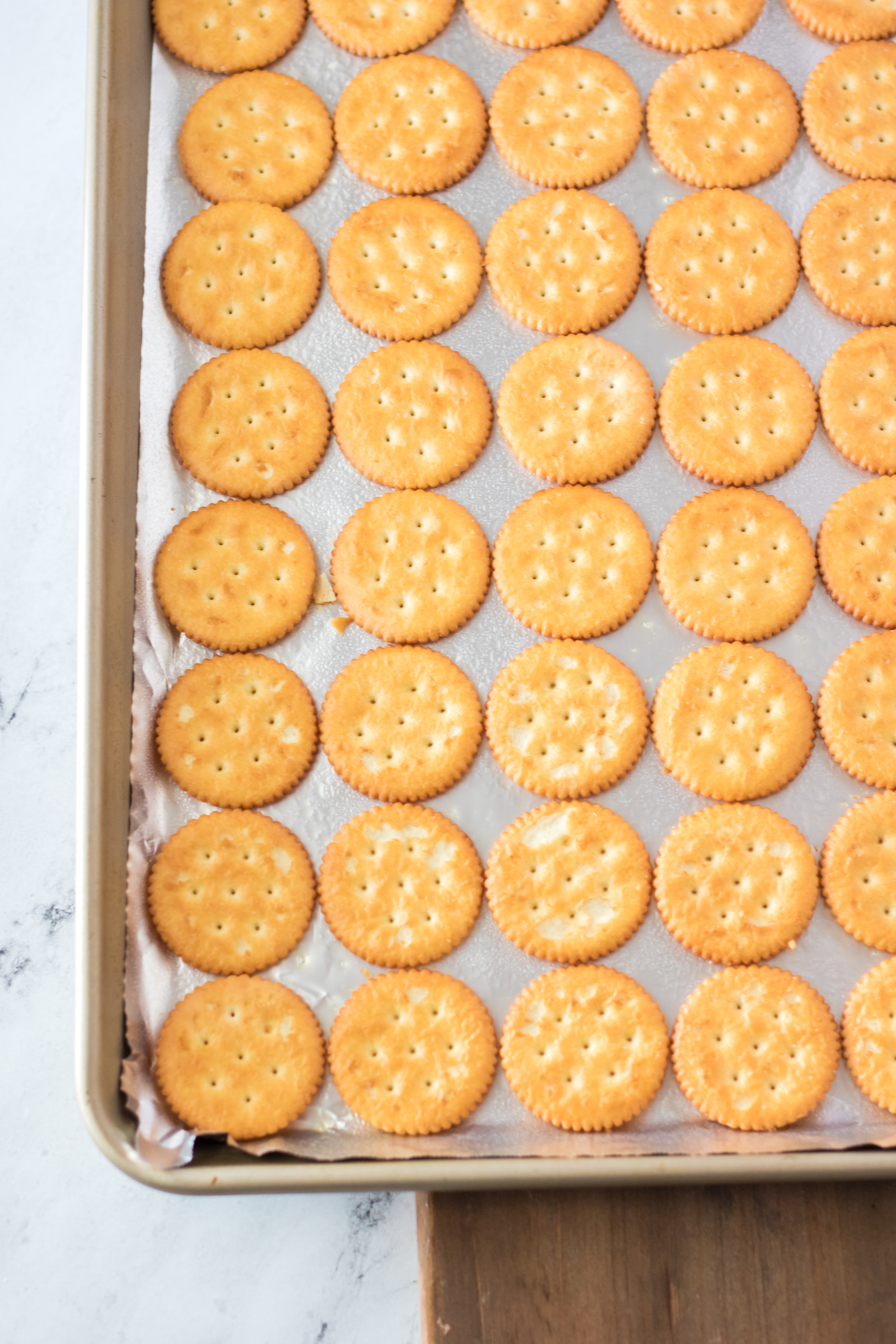 - Place crackers in single layer in pan.