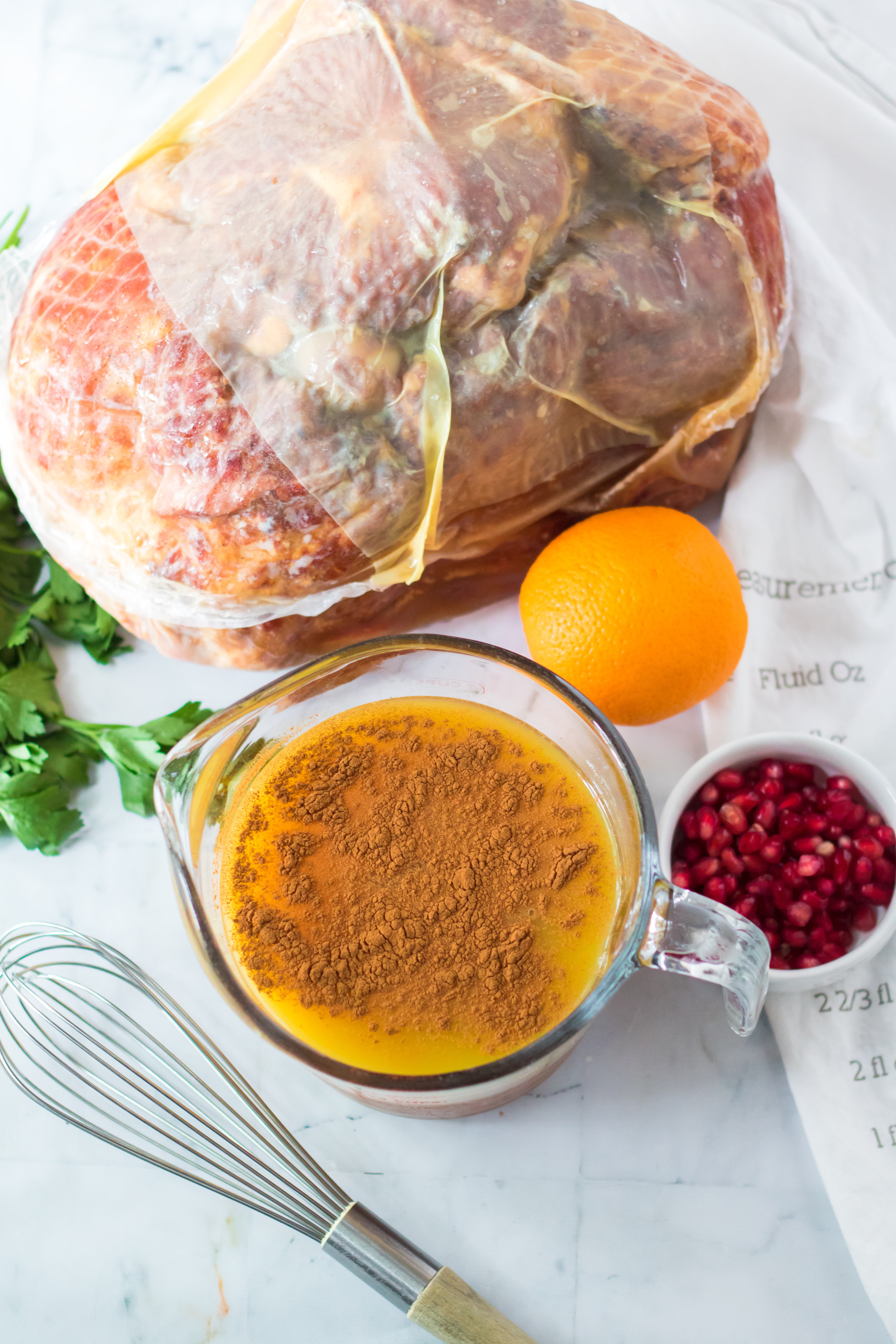 It isn’t Christmas without a gorgeous glazed ham and this Christmas Ham is perfect! Orange juice, brown sugar, honey and cinnamon make up a delicious glaze for this ham. Orange zest, pomegranate seeds and parsley give this ham it’s festive colors. This ham smells and tastes like Christmas Day and is sure to become your new holiday ham.