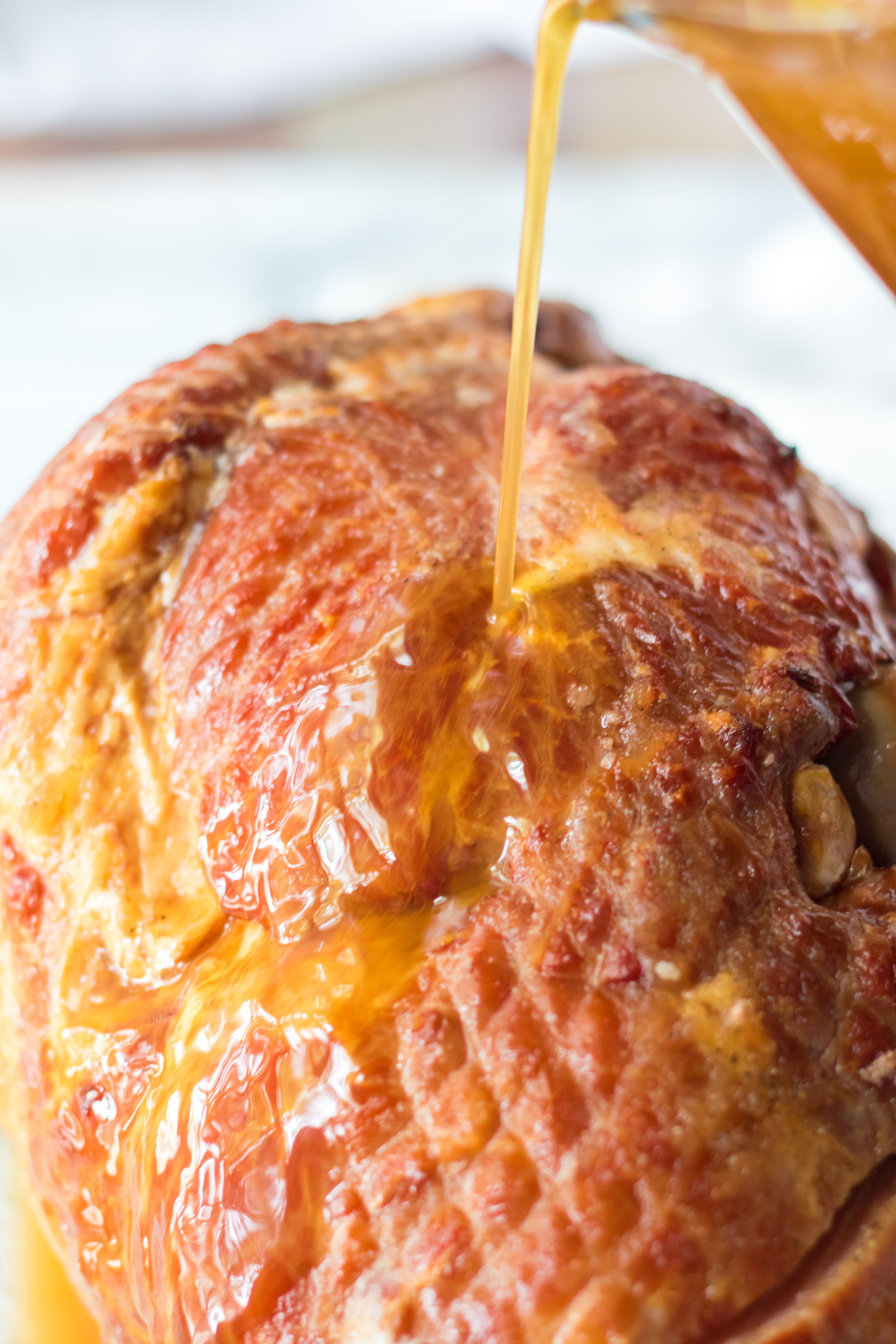- Pour the thickened glaze all over the ham.