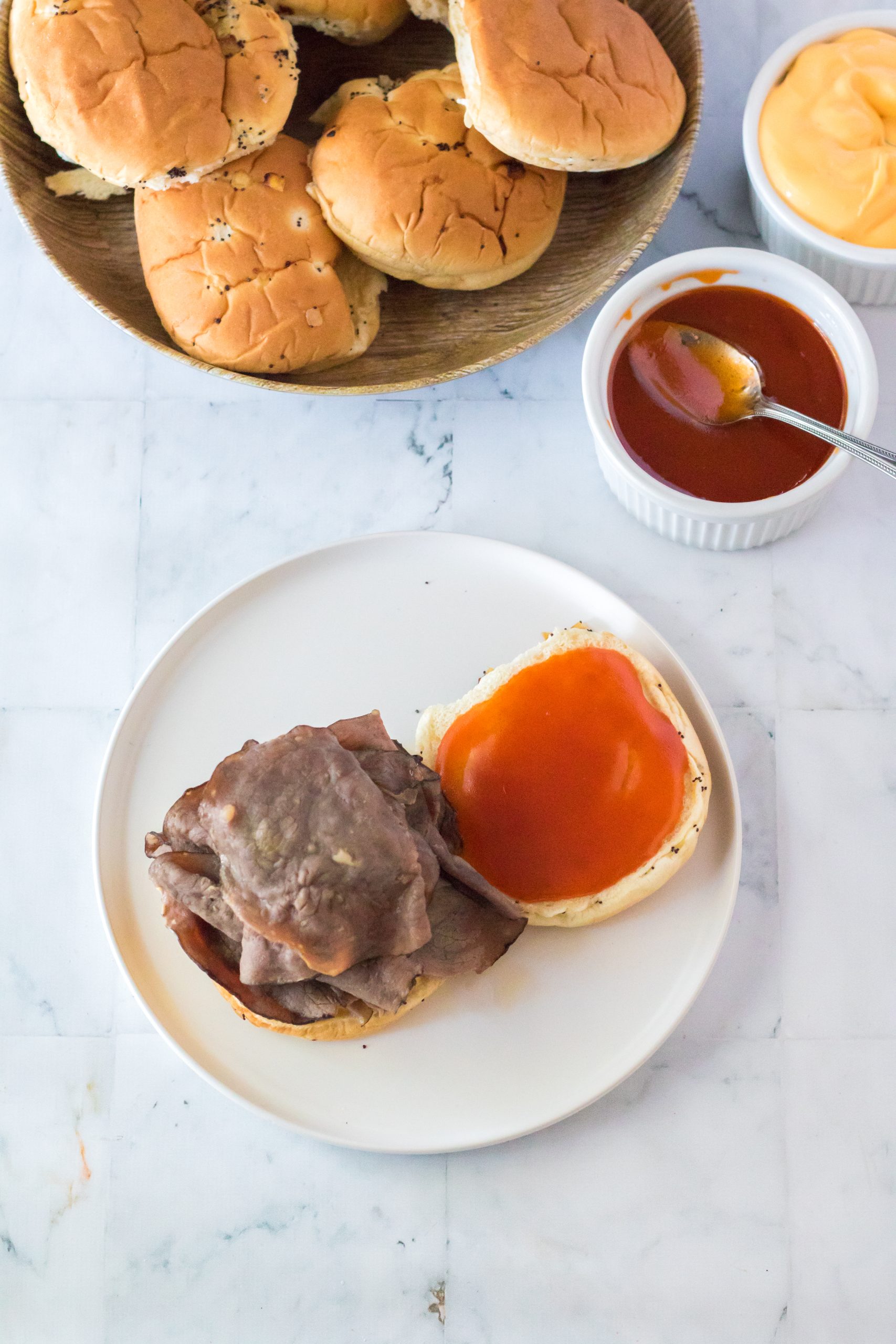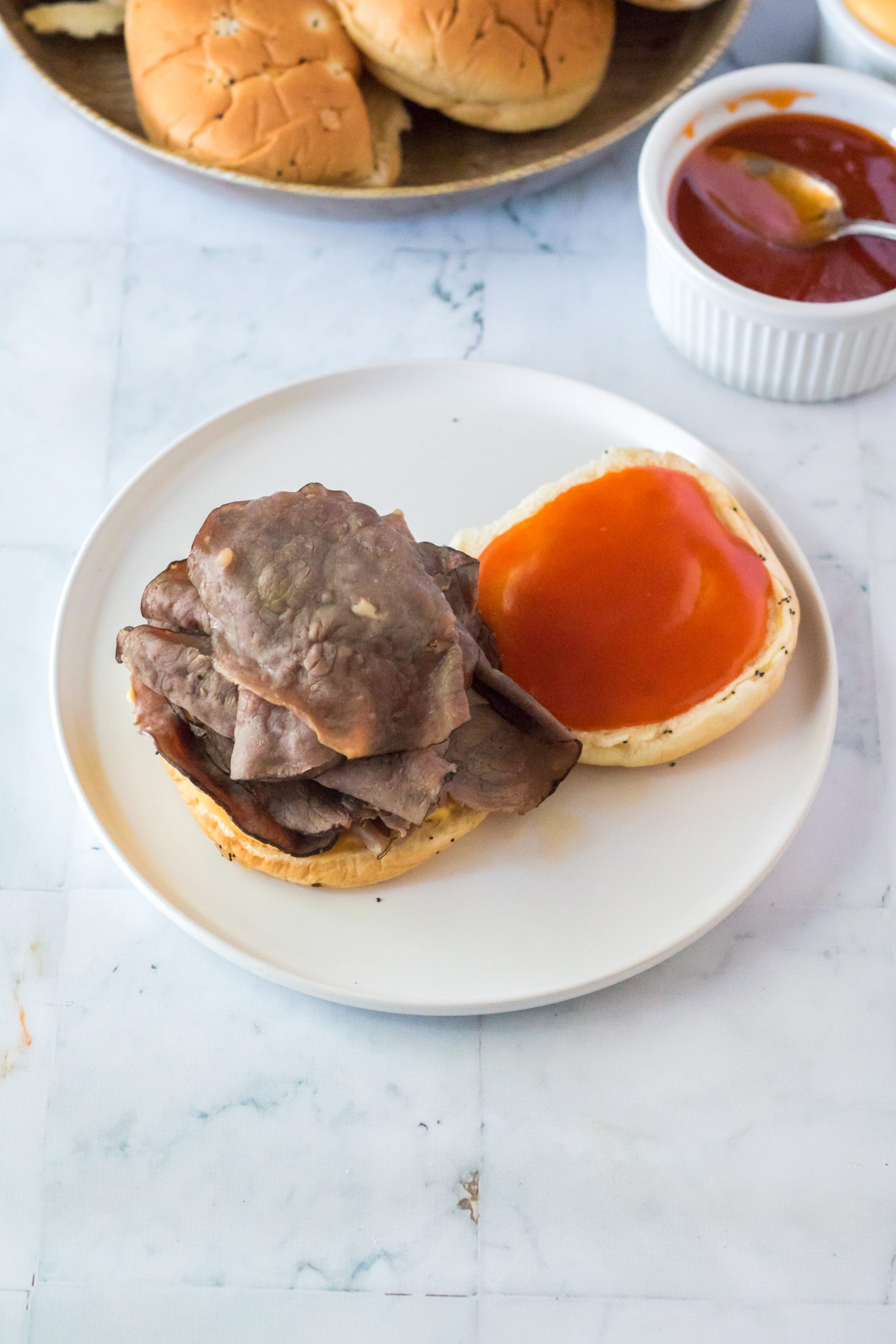7. To the bottom bun add ¼ of the roast beef.