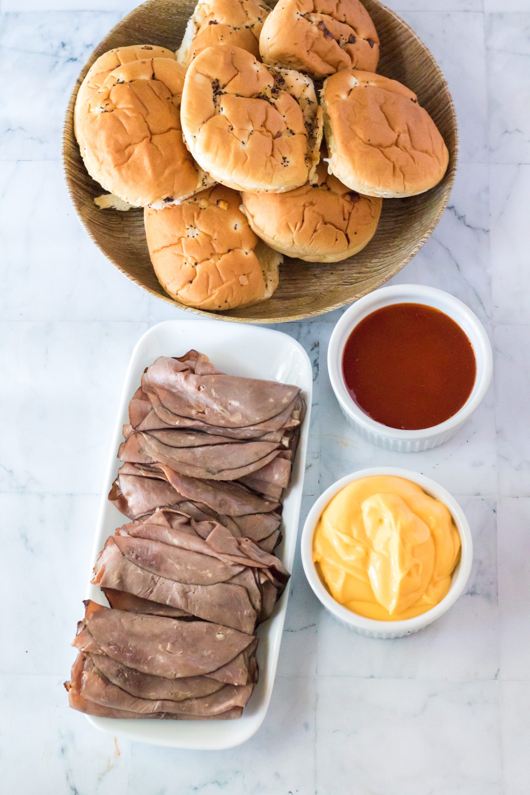 - Deli roast beef- You can use prepackaged deli roast beef for this or head to the deli counter and get some fresh sliced. Either way these sandwiches will be delicious and give you a good copycat arby’s beef flavor! You do want to make sure it is a thinly sliced roast beef.