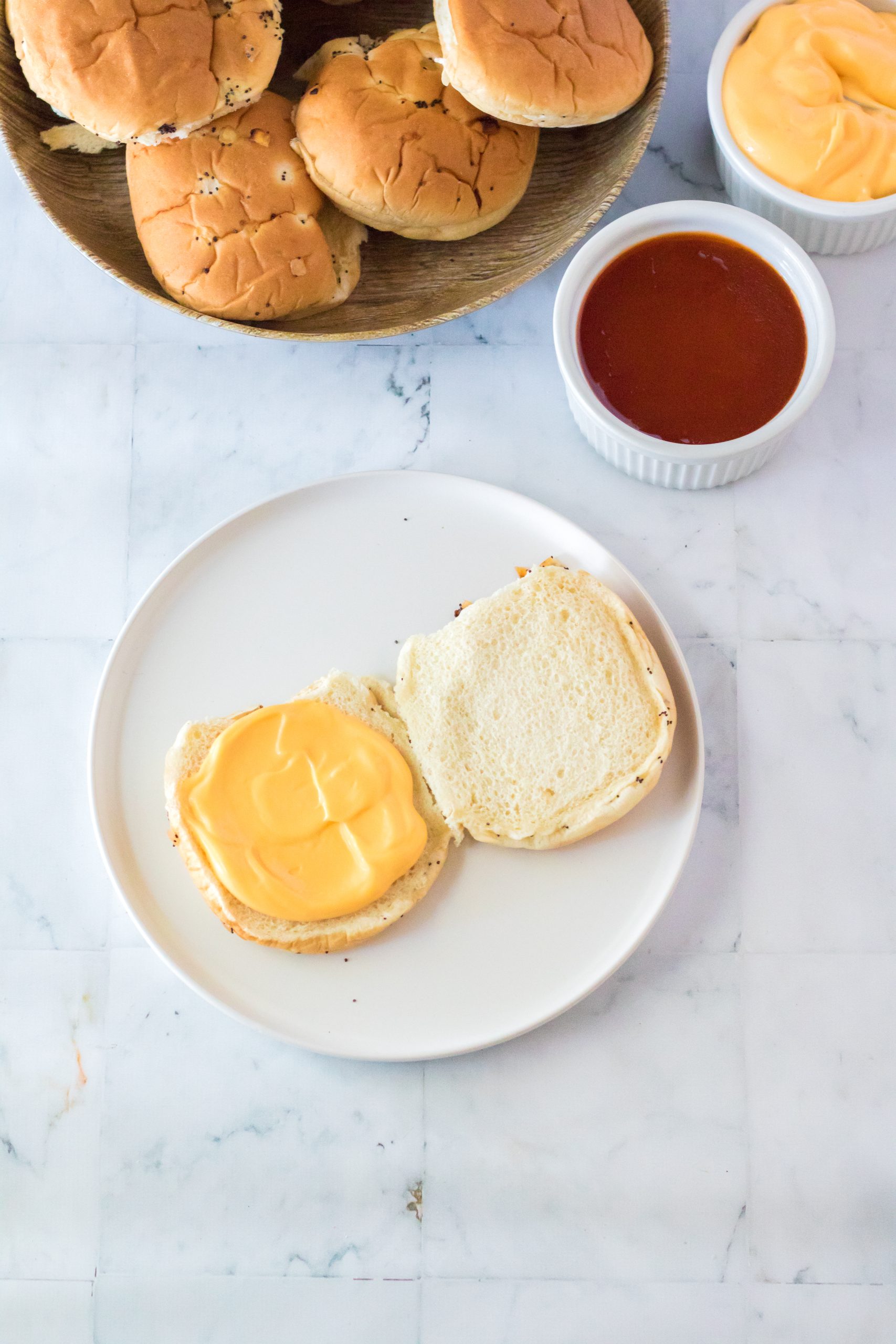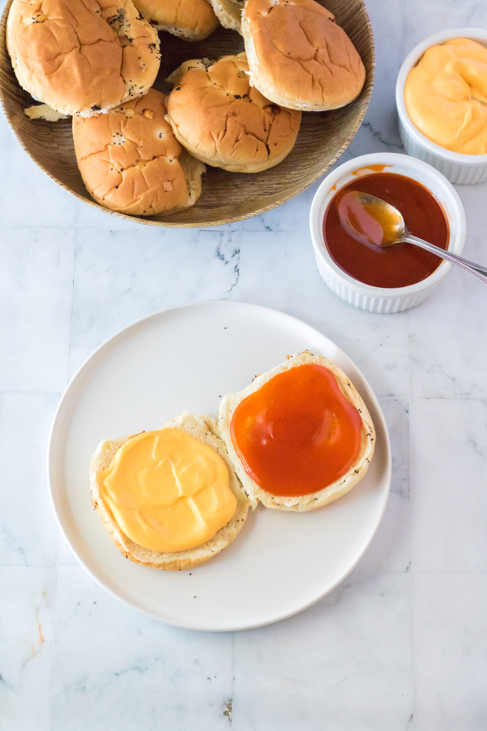 5. Start with the bottom bun and ¼ cup of the cheese sauce.