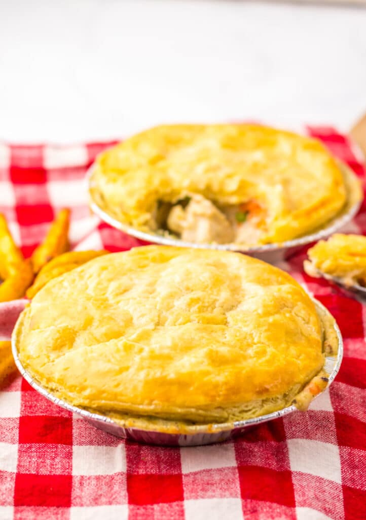 This Copycat KFC Chicken Pot Pie is full of flavor and a creamy sauce all under a flaky crust. Tender chicken, carrots, peas and potatoes are baked together in a seasoned creamy sauce before getting topped with the flakiest crust. These taste just like the drive thru but are much tastier!