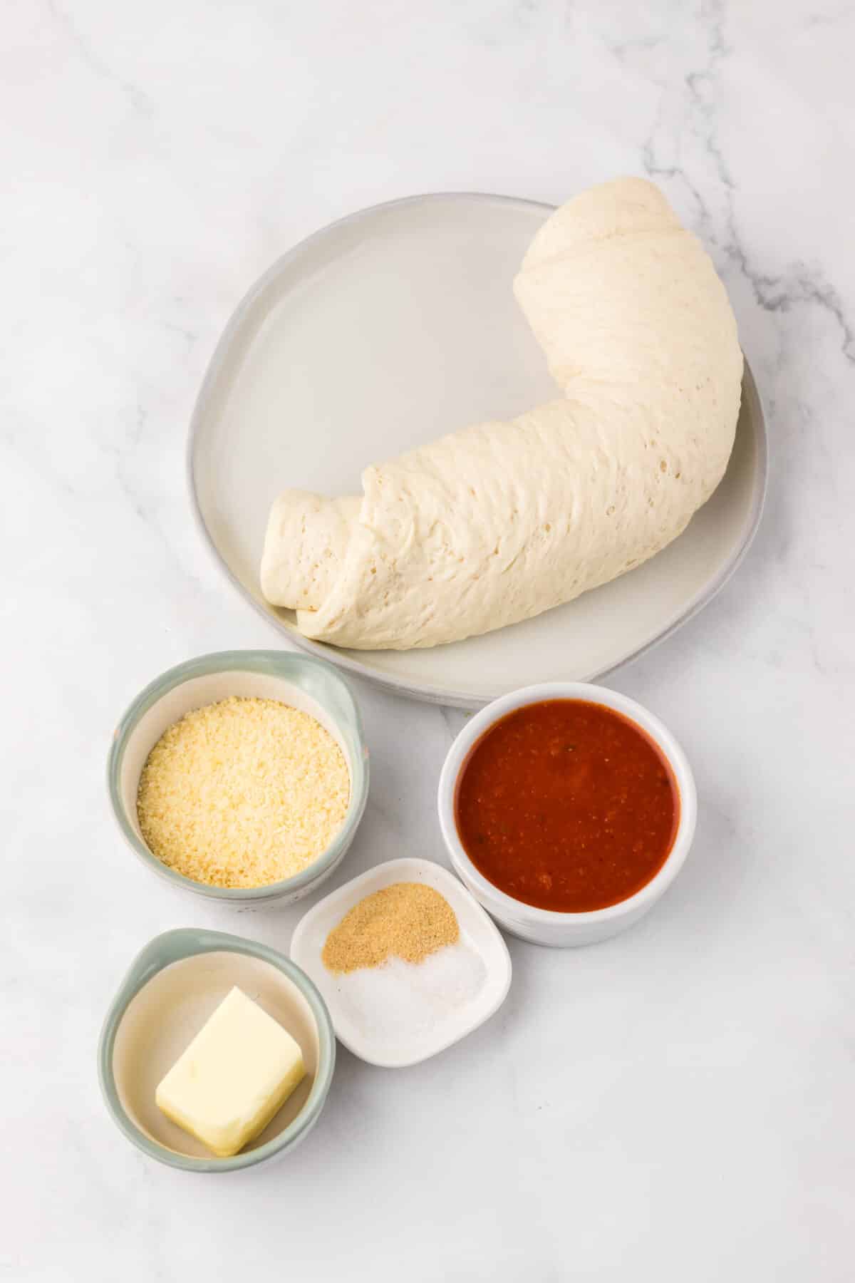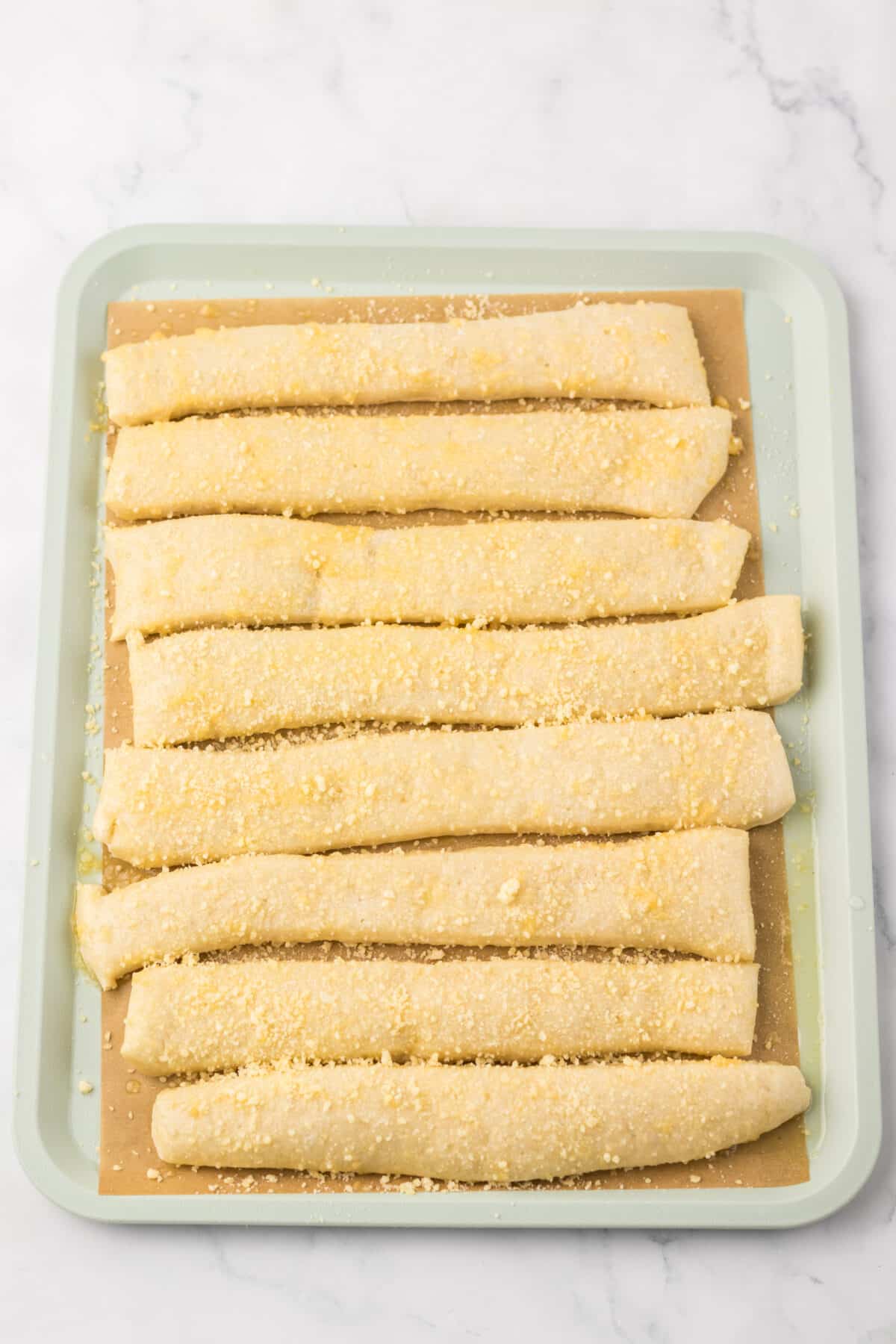 - Roll out pizza dough into a rectangle about 9x13 inches. Use a pizza cutter to slice into 12 breadstick strips.