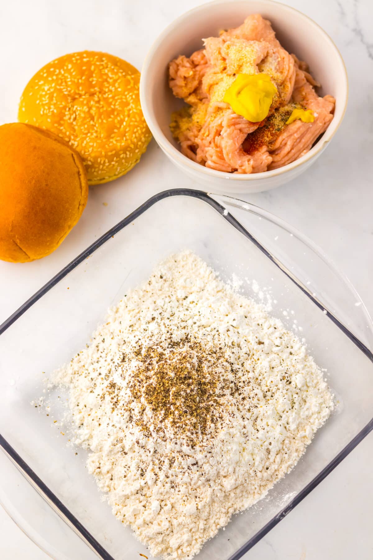 - In a large bowl combine the ground chicken, garlic powder, onion powder, mustard, ½ teaspoon salt, 1 teaspoon black powder and ½ teaspoon paprika.