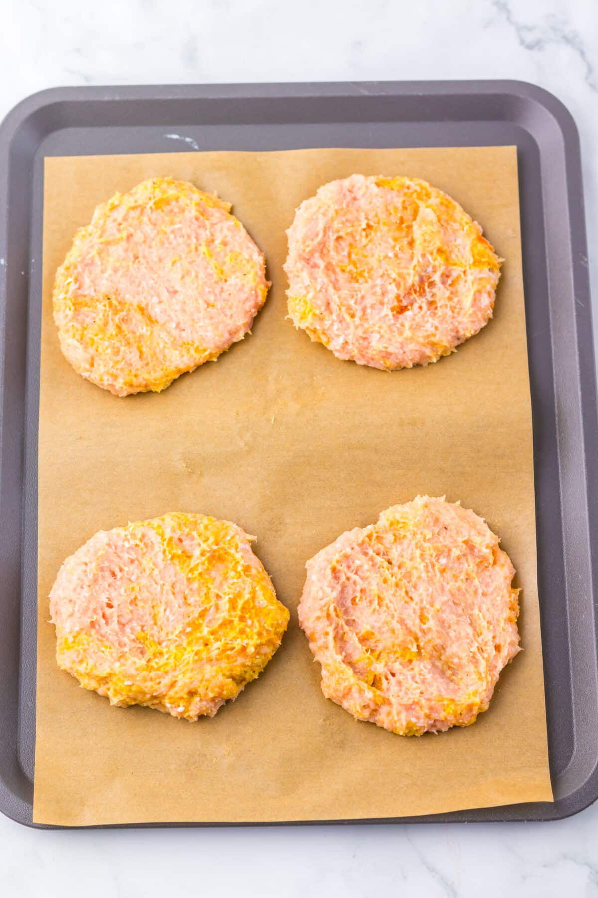 - Shape chicken mixture into 4 patties and freeze on a parchment paper-lined baking sheet for 30 minutes.