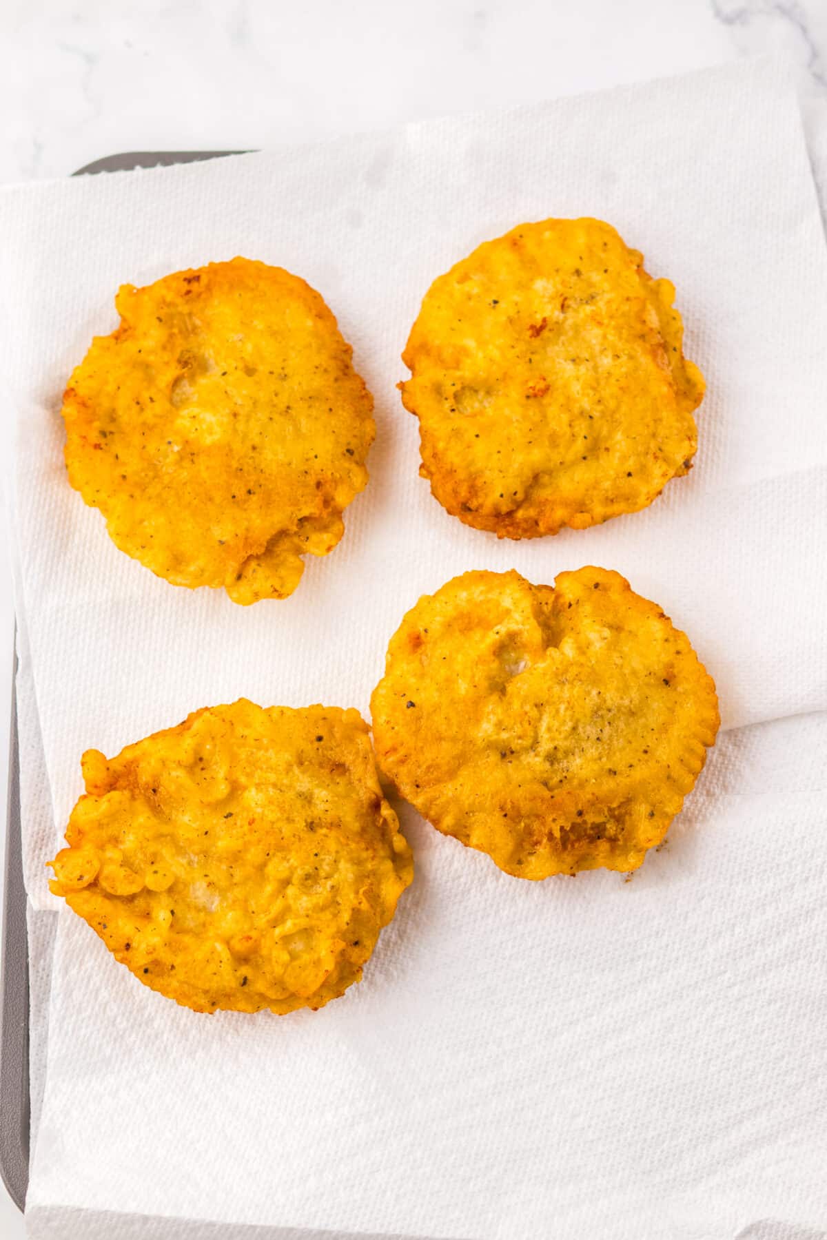 - Fry until golden brown and cooked through about 5 to 6 minutes per batch flipping if needed.