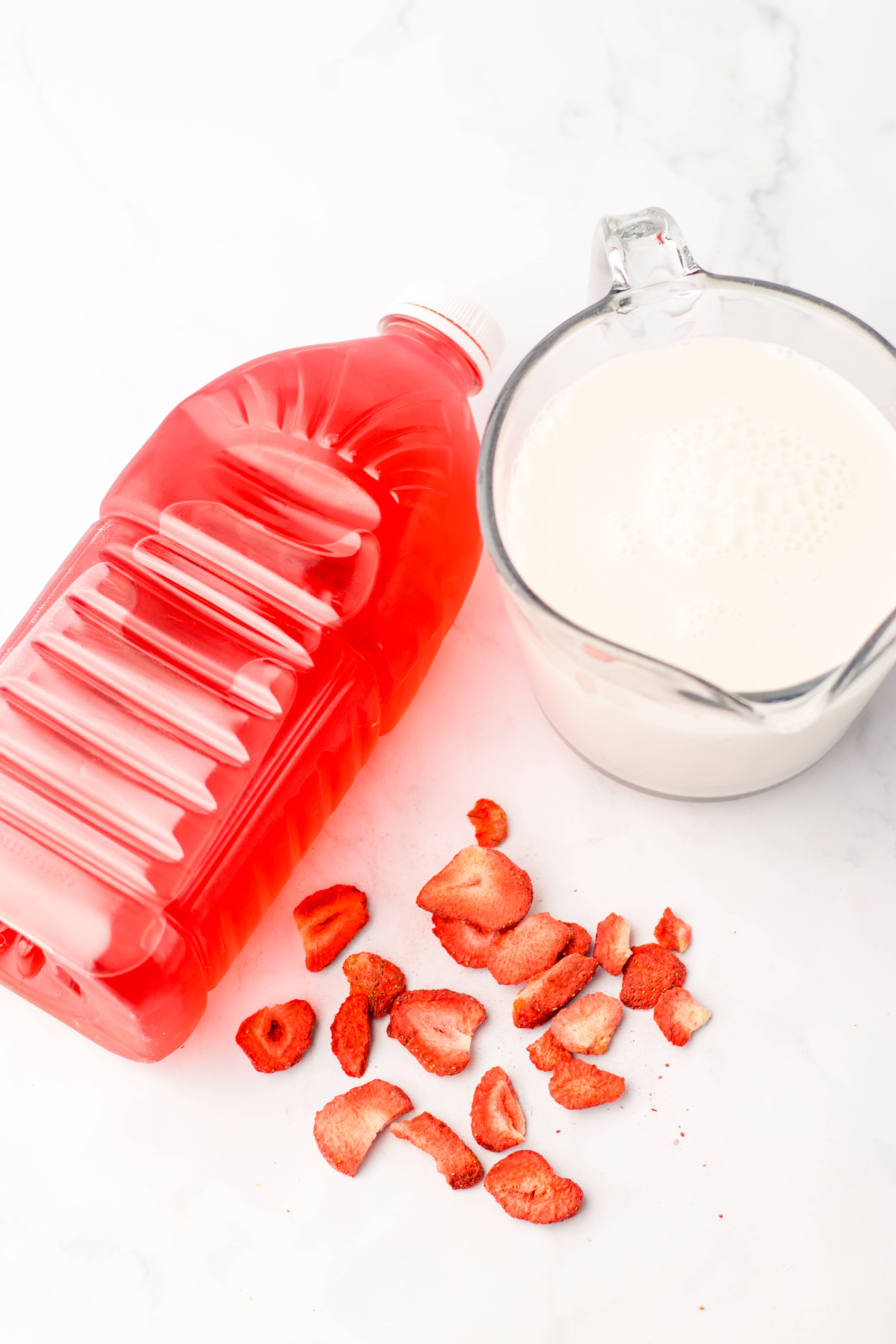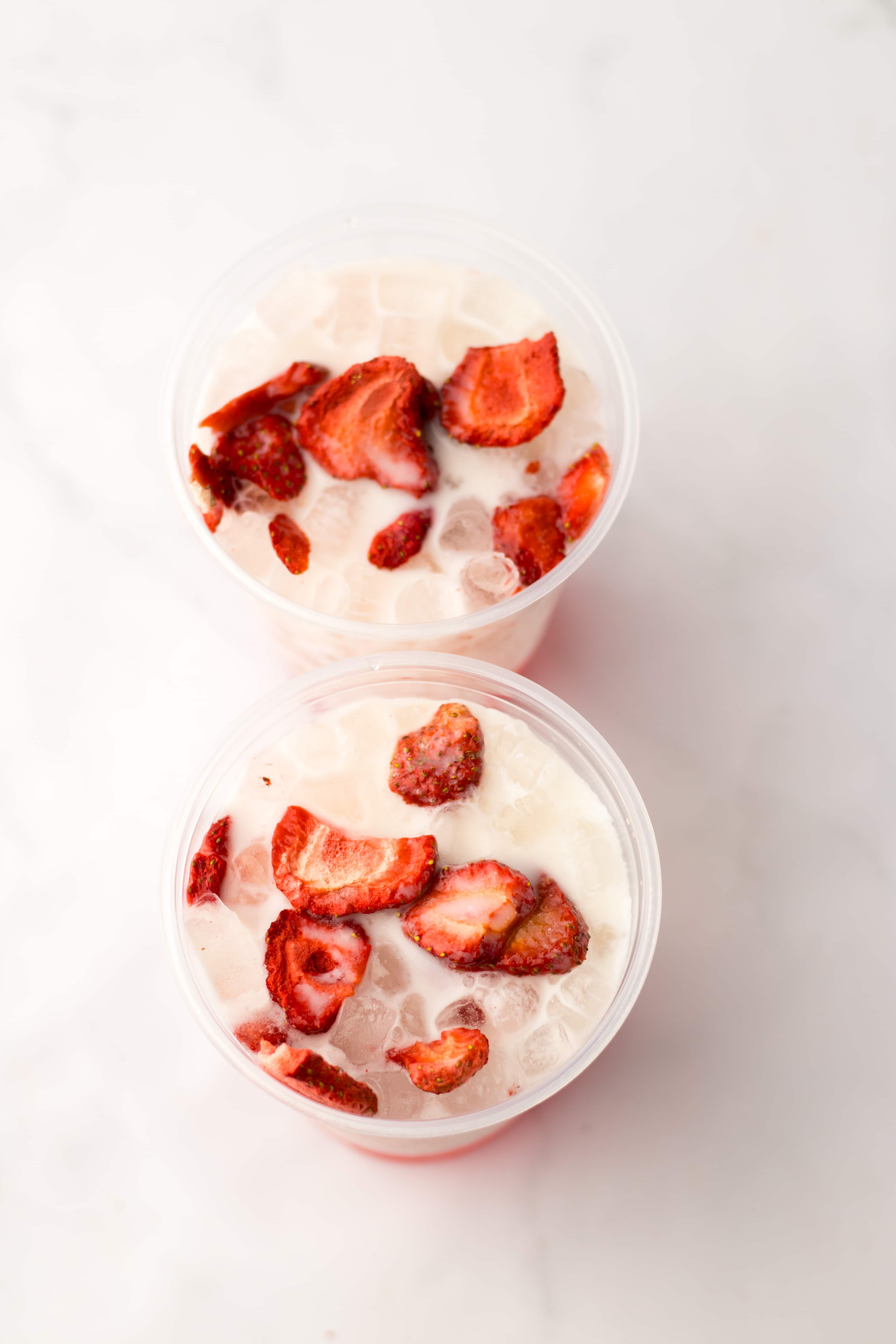 Freeze-dried strawberries – These are the finishing touch! Not only do they add that authentic Starbucks look, but they infuse the drink with extra strawberry flavor as they soften. You can also use fresh strawberries if you have them.
