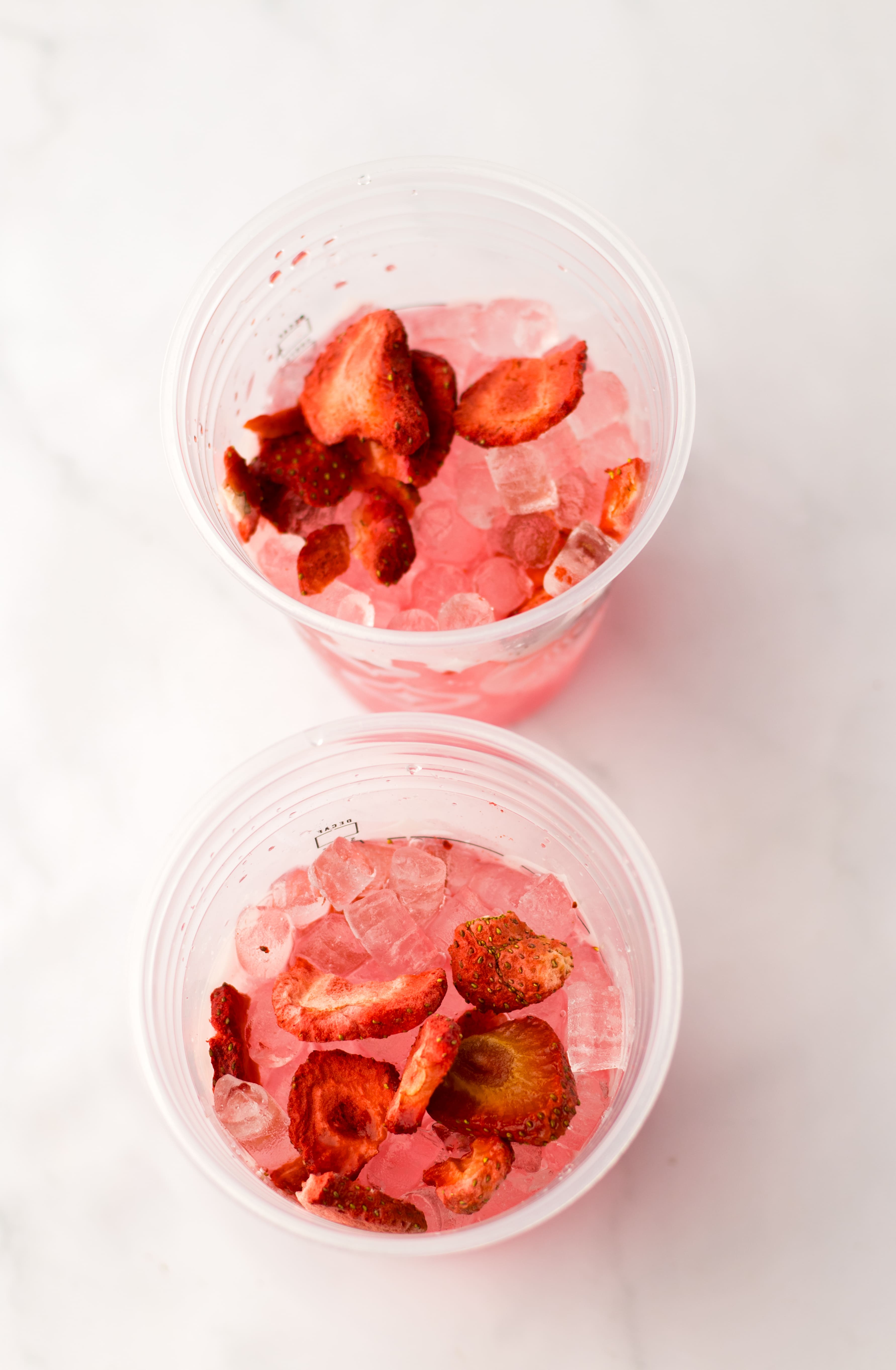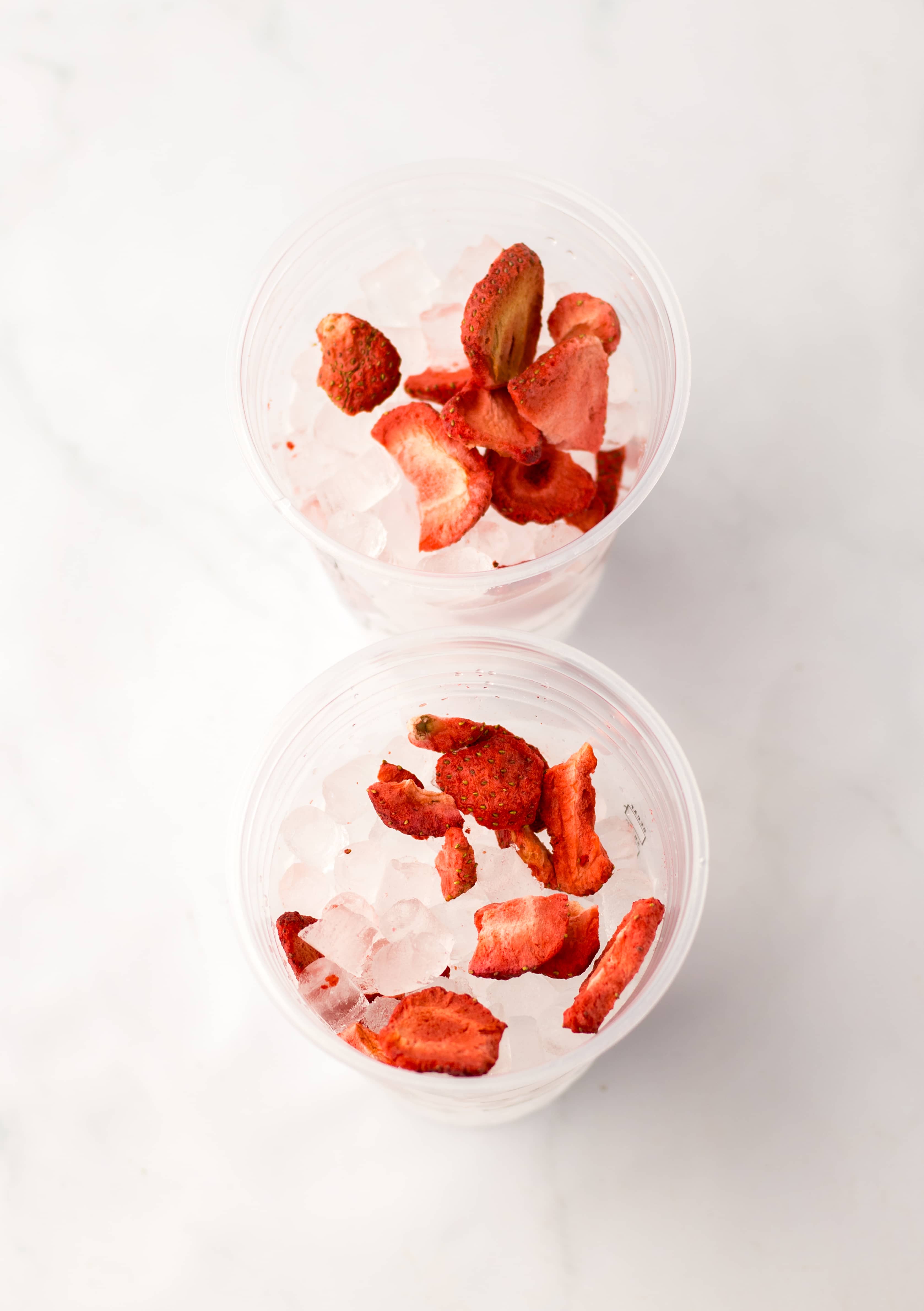 - Fill your cup with ice and toss in a few freeze-dried strawberries (or sliced fresh ones).