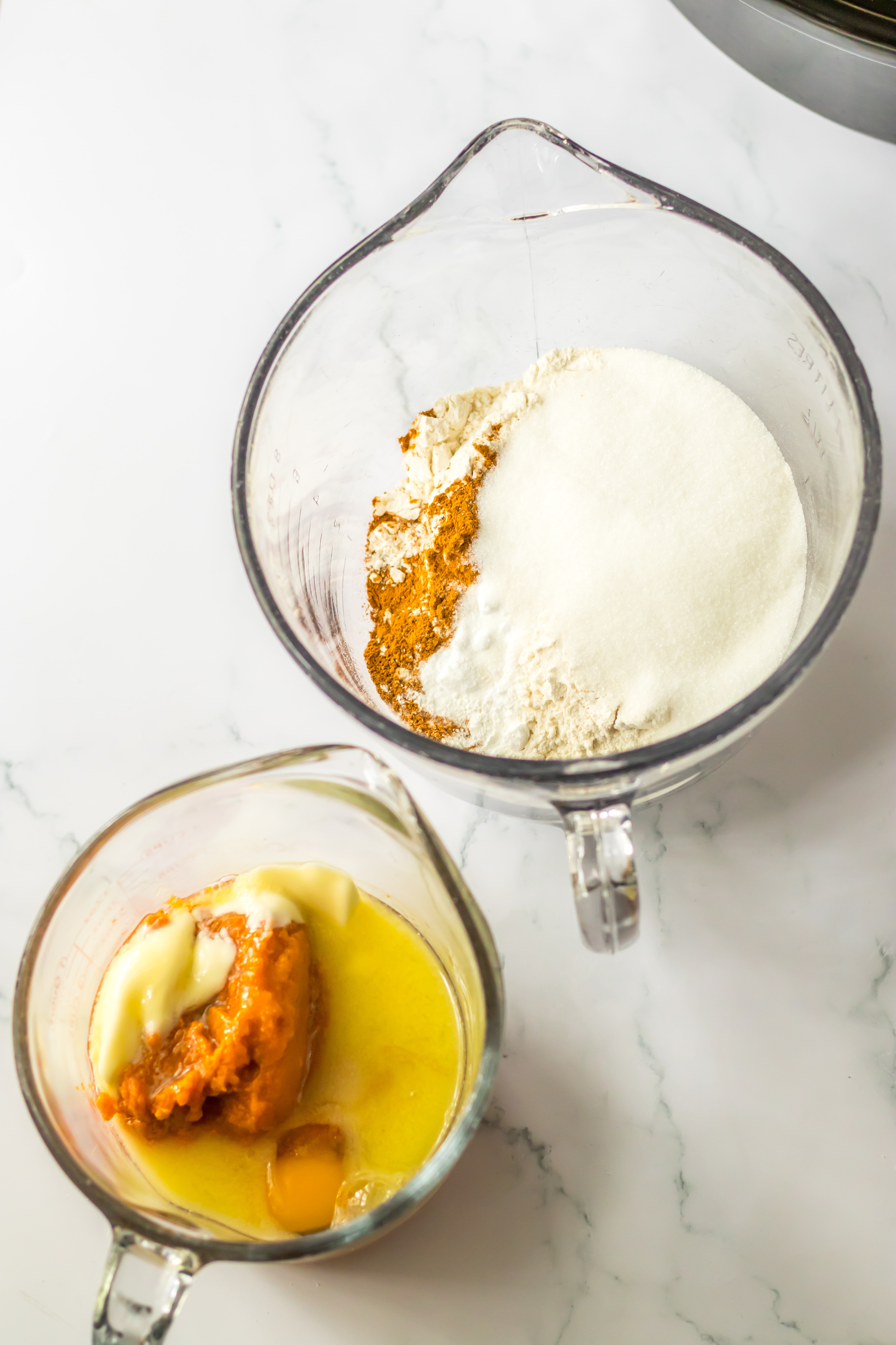 - In a mixing bowl whisk together the flour, sugar, baking soda, baking powder, pumpkin pie spice and salt.