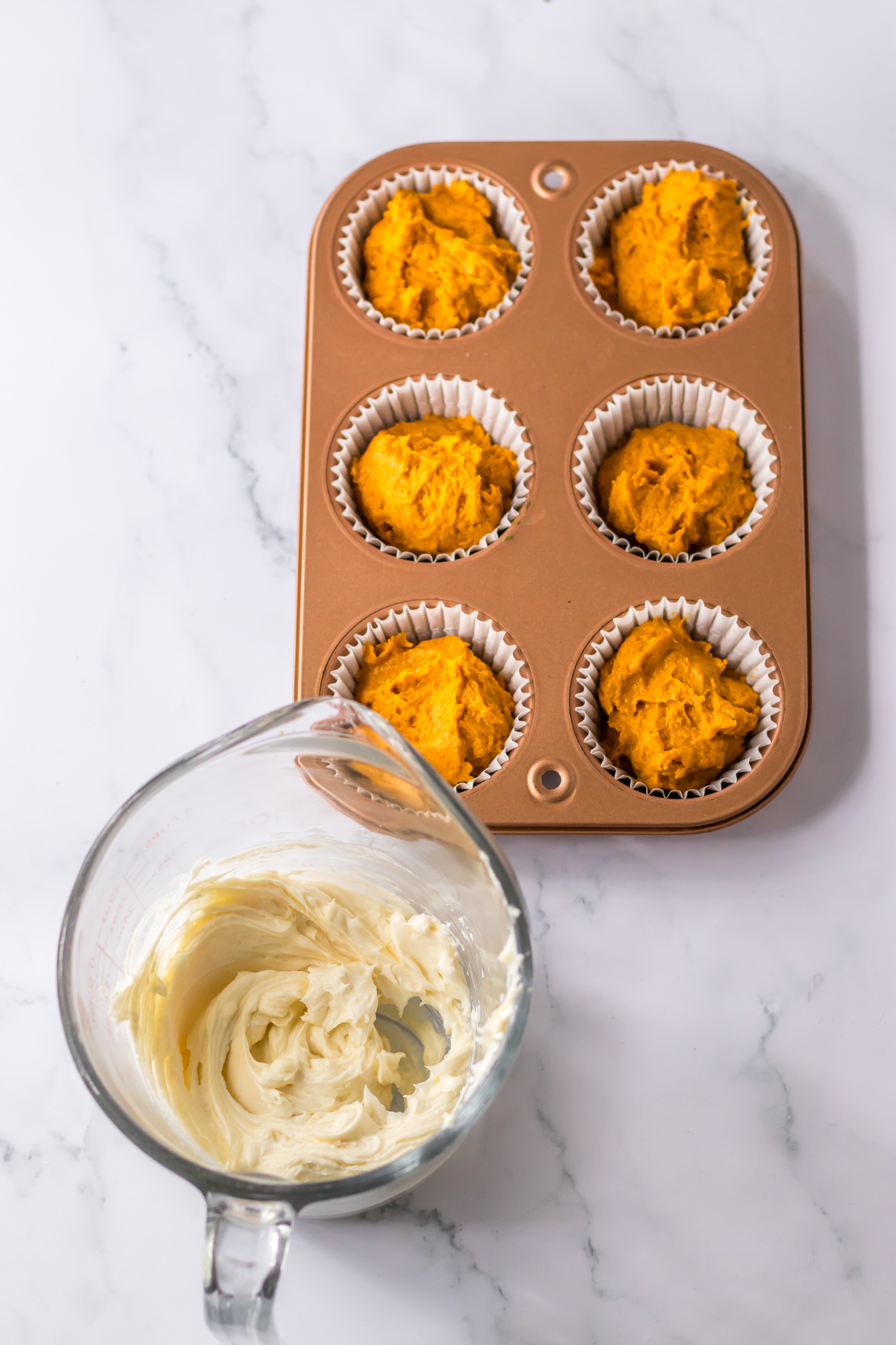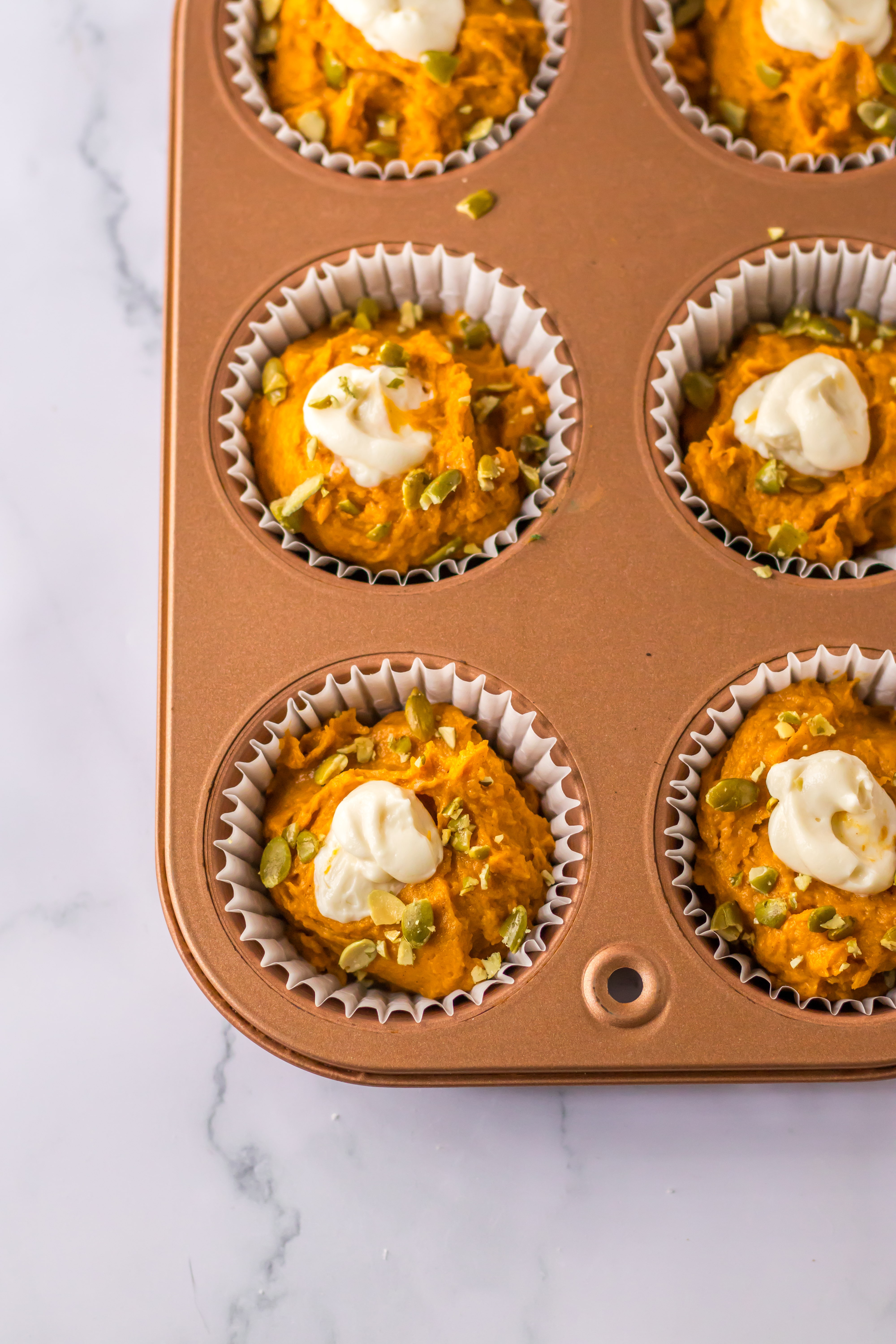 - Fill your lined muffin tin with the batter.