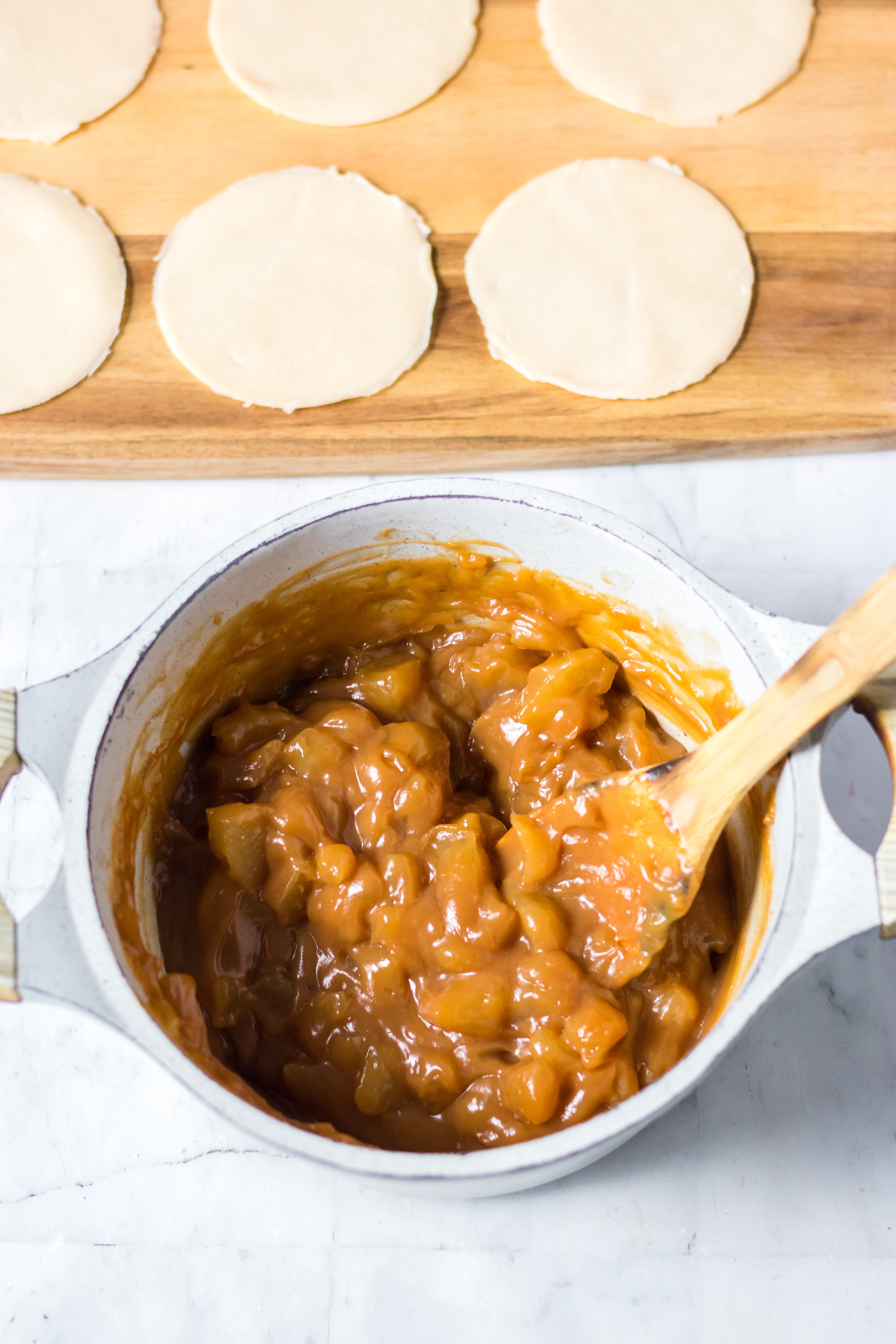 1. In a medium saucepan over medium heat add your apple pie filling and caramels.
