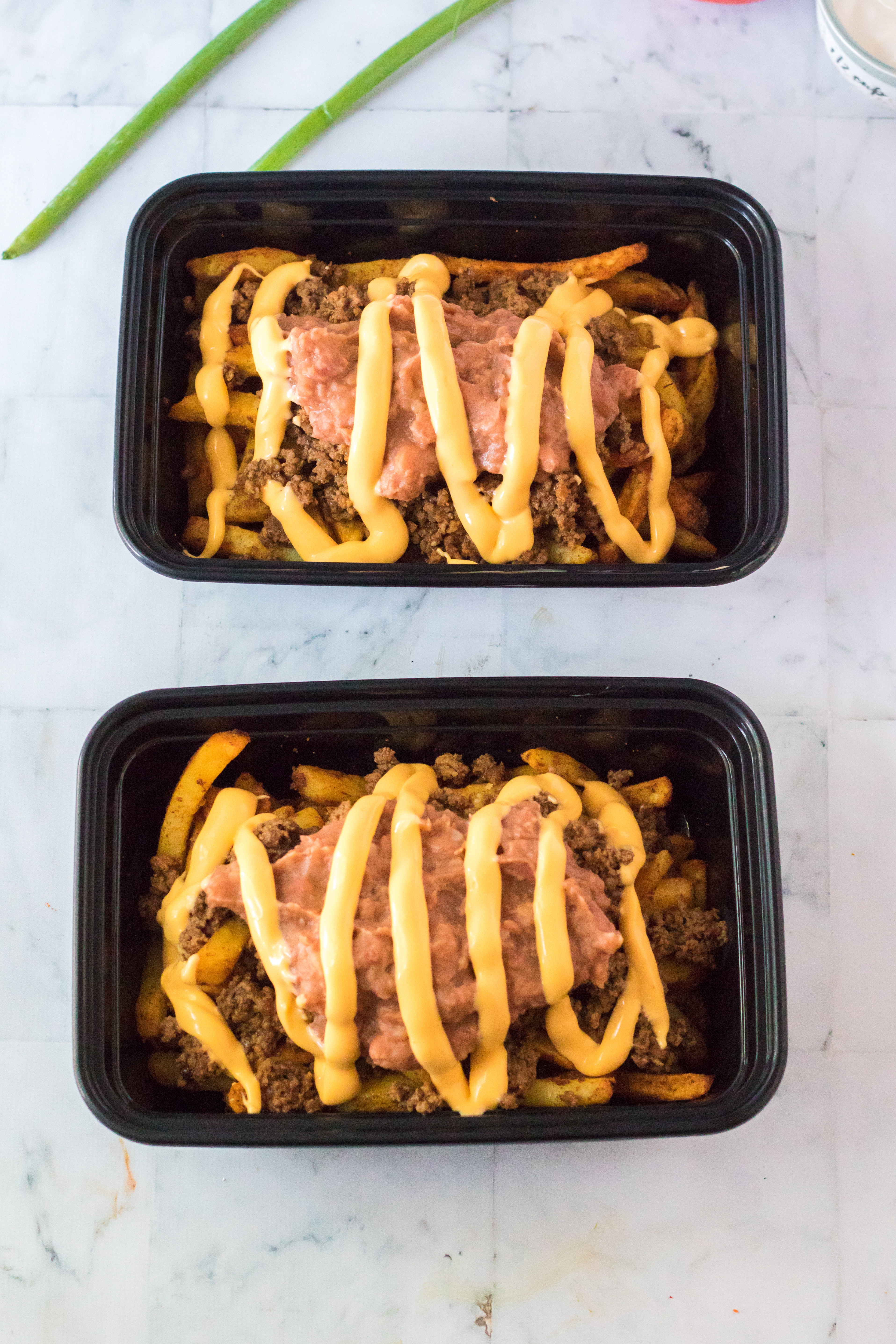 - Place down your fries, then meat, then beans, then cheese, then sour cream for topping.
