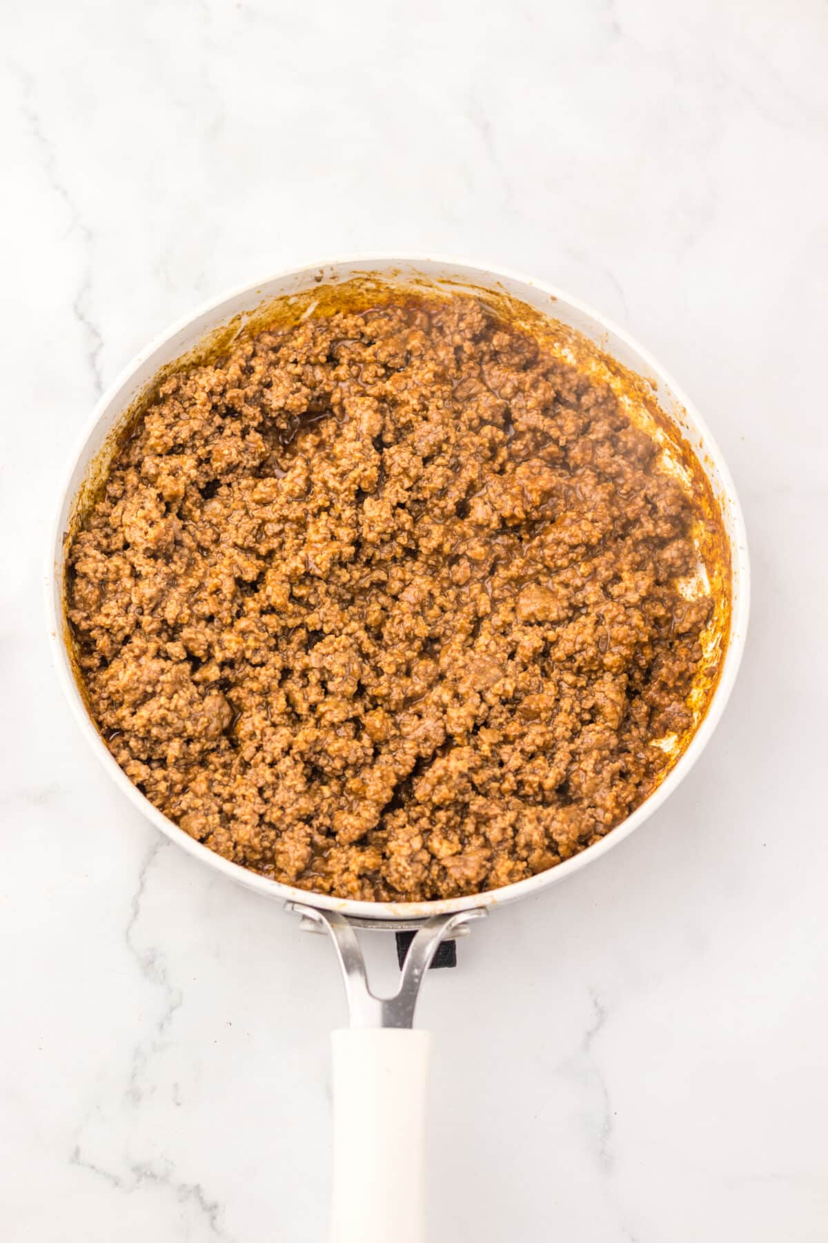 In a skillet over medium heat, cook the ground beef until fully browned. Drain off any excess grease.