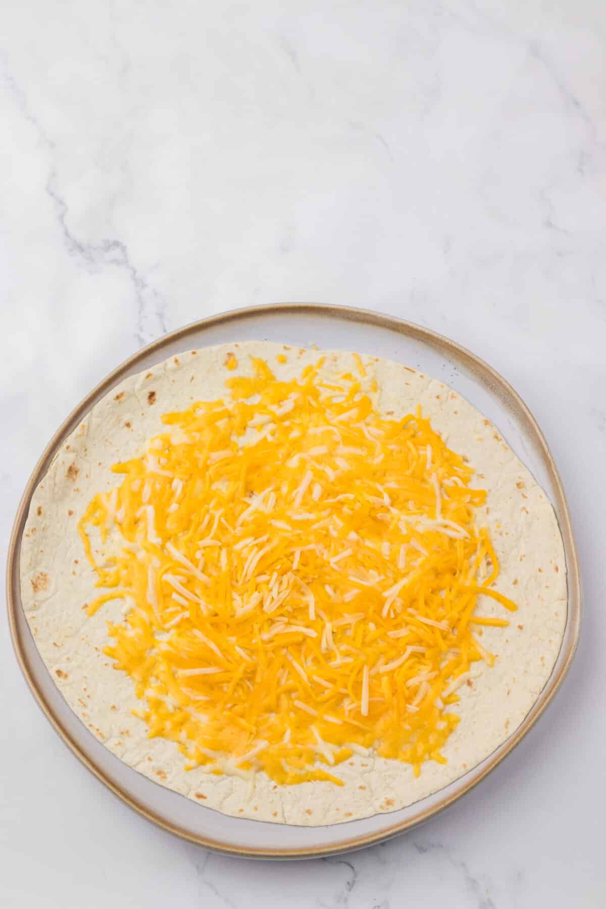 - Warm a tortilla in a skillet over medium heat and sprinkle with a generous handful of shredded cheese. Top with a second tortilla and let it melt together into a cheesy quesadilla “shell.”