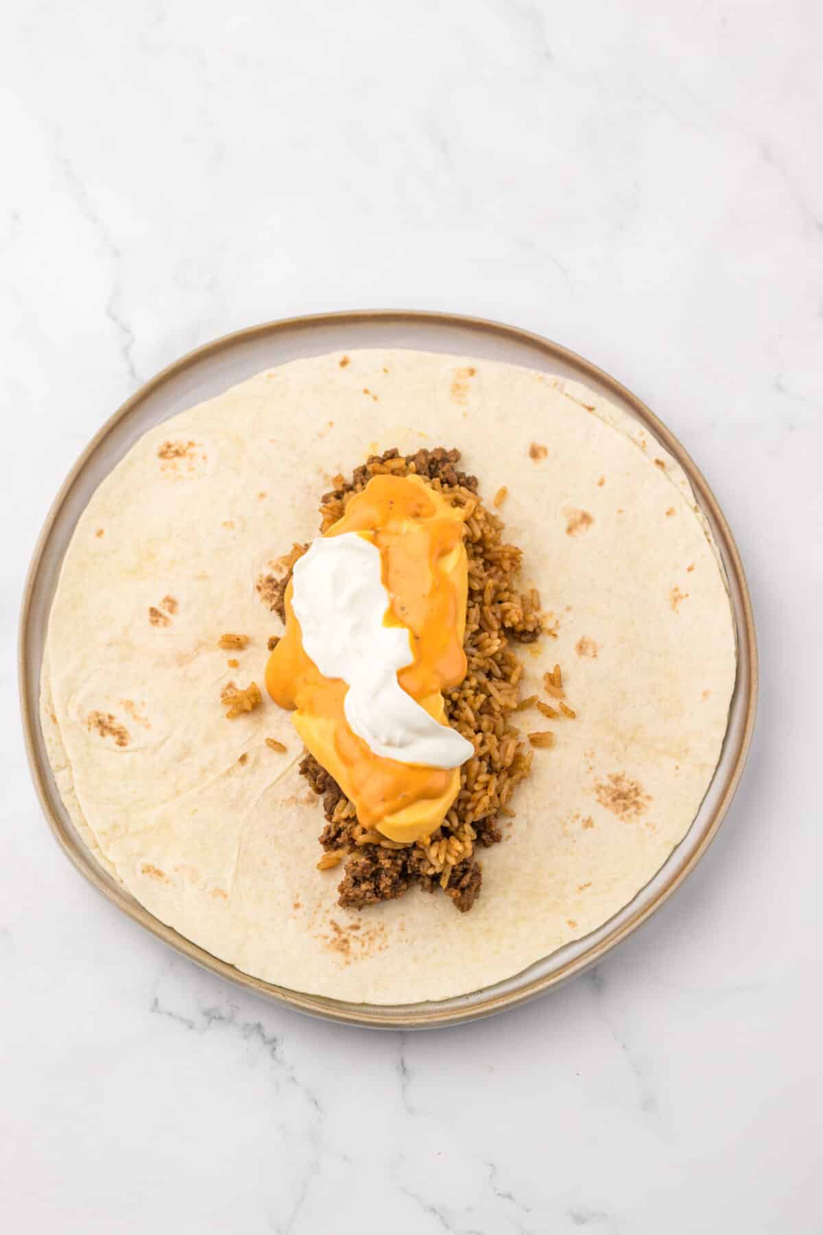 - Lay the quesadilla flat and add a line of seasoned rice, taco meat, nacho cheese sauce, sour cream, and chipotle sauce.