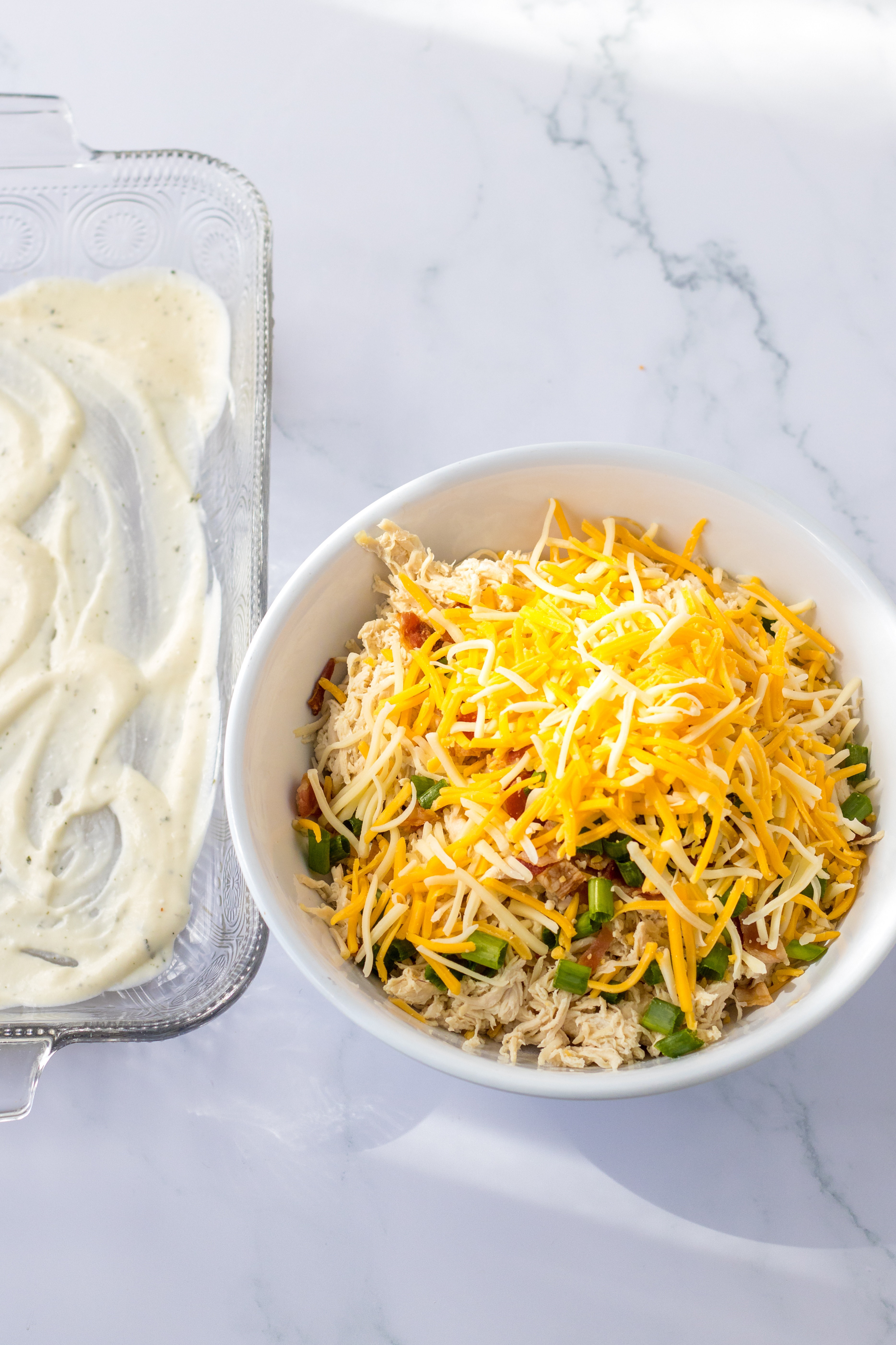 - In a large bowl combine the shredded chicken with half of the cheese, half of the bacon and half of the scallions.