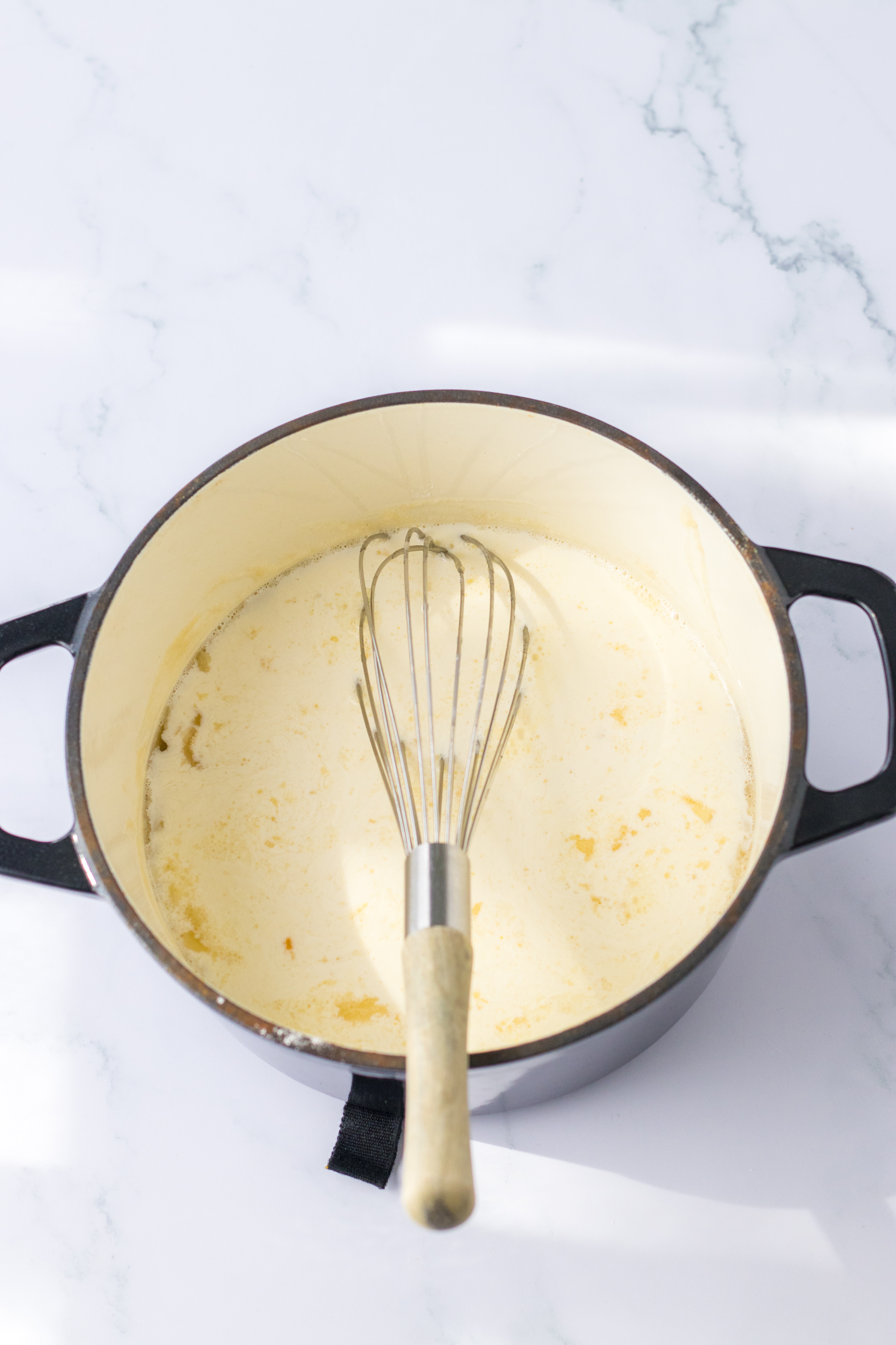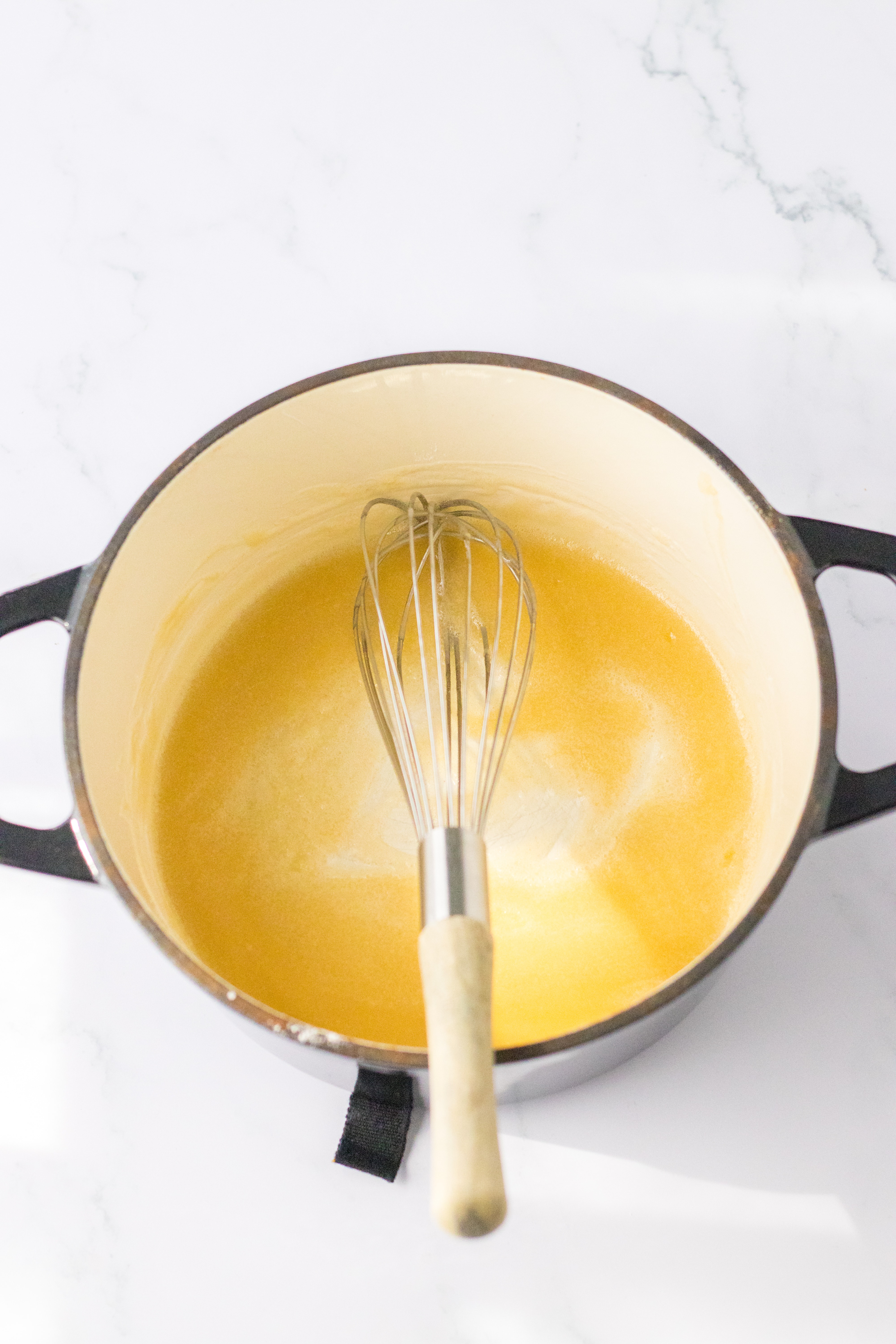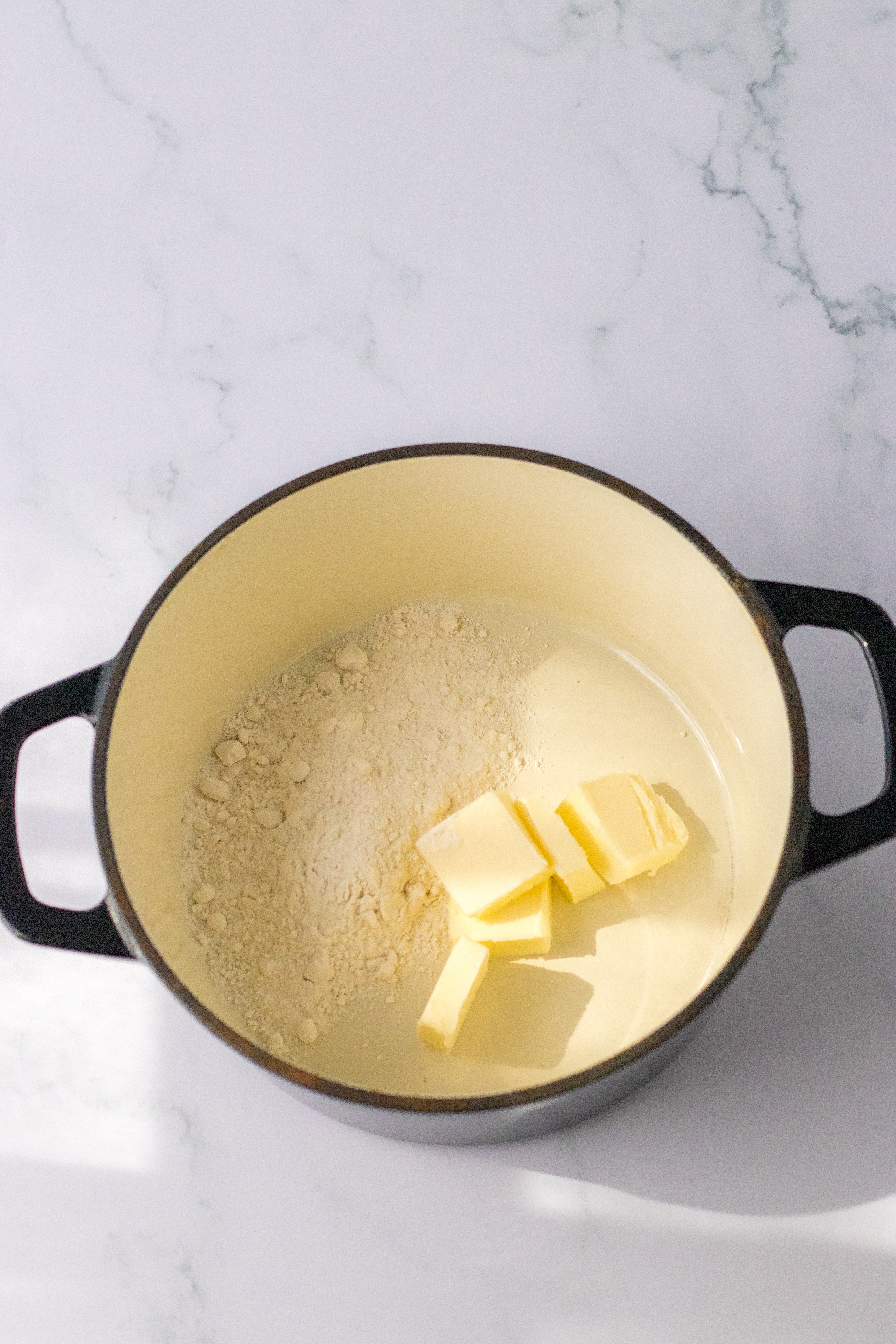 - In a saucepan over medium heat melt the butter and whisk in the flour until it forms a paste.