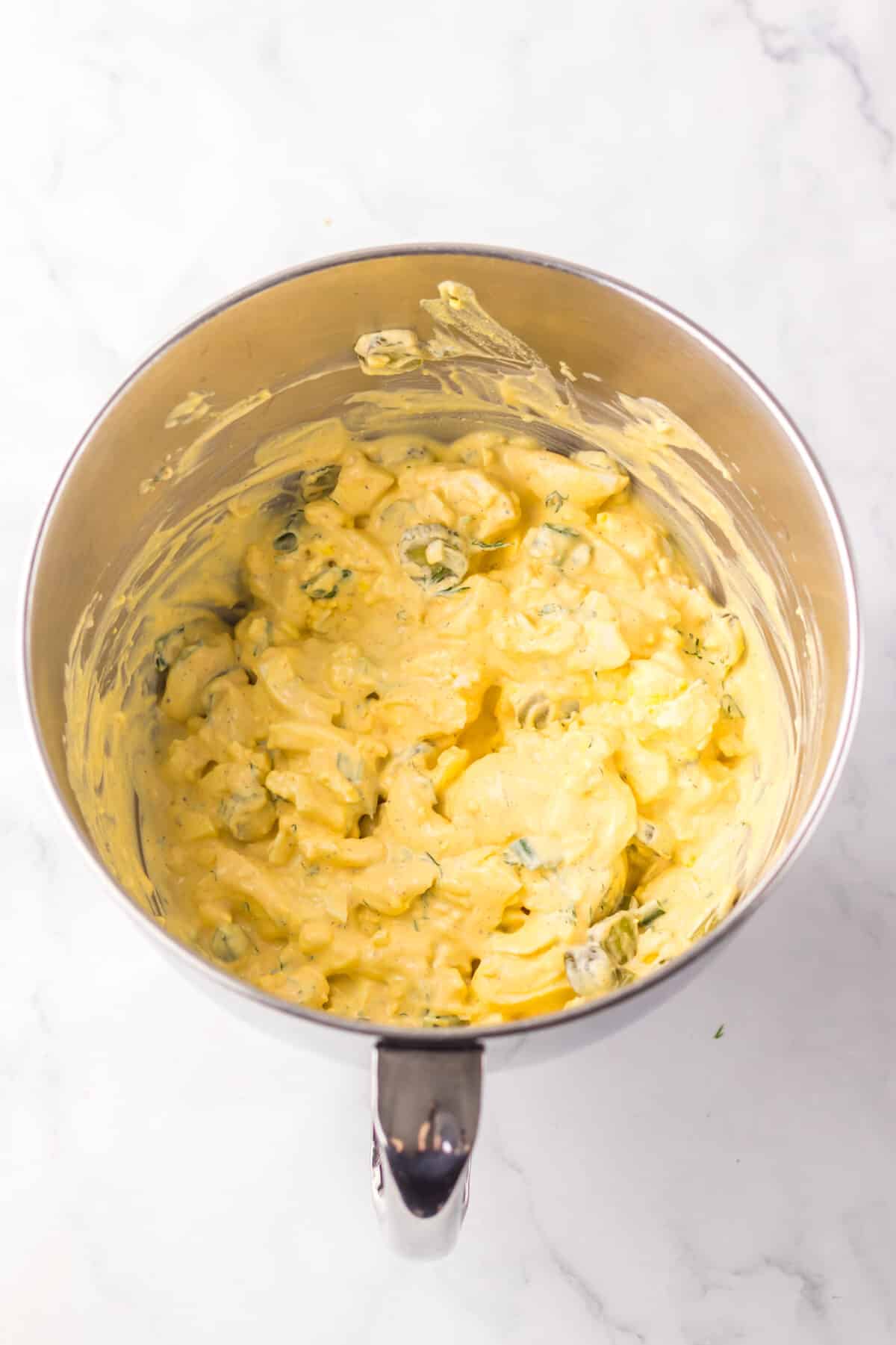 - Add the dressing into the egg mixture and toss gently to combine.