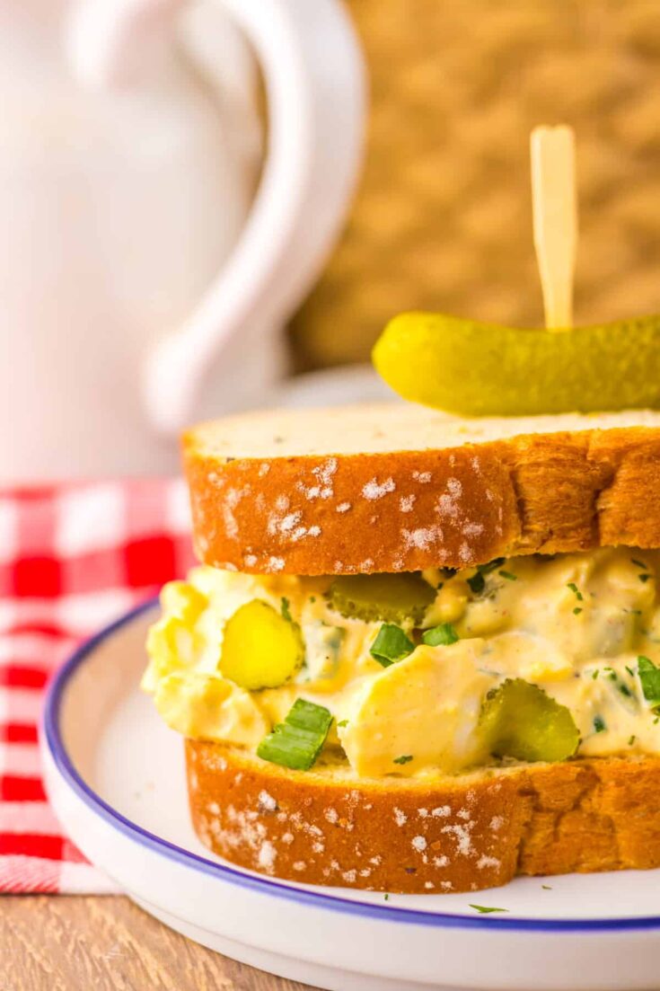 Egg salad is my go to for a quick lunch, I love to whip up a big batch at the beginning of the week and having it ready to go anytime I need a delicious lunch! Everyone in my house loves egg salad sandwiches and we of course love pickles so putting them together was a no brainer!
