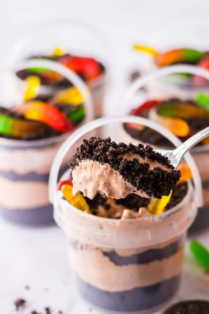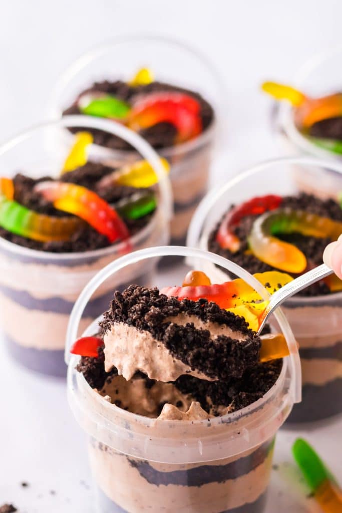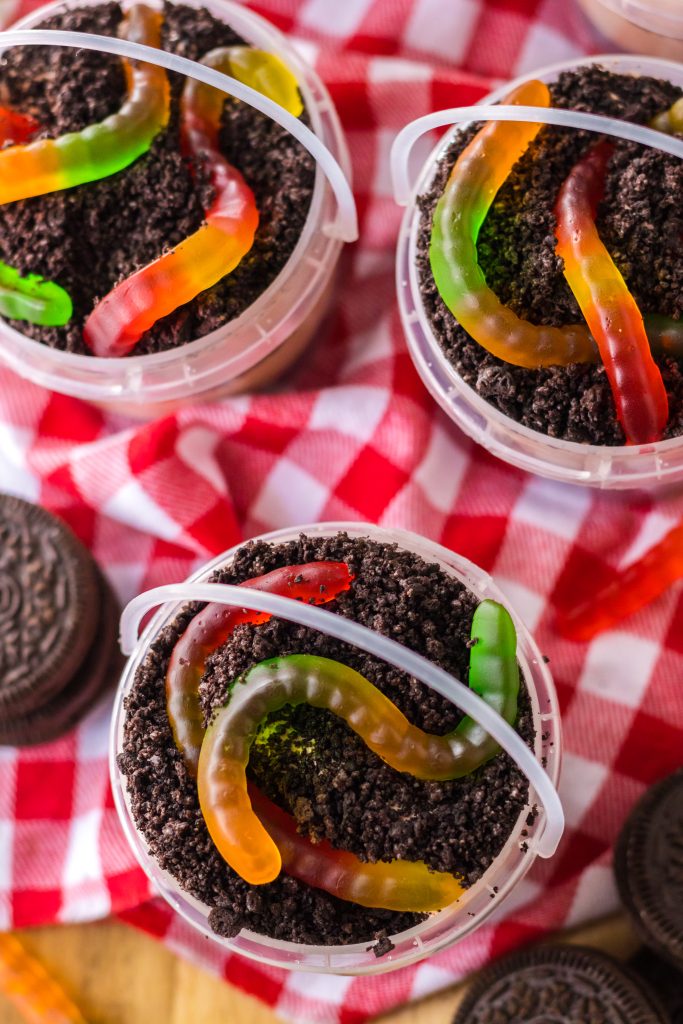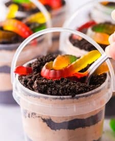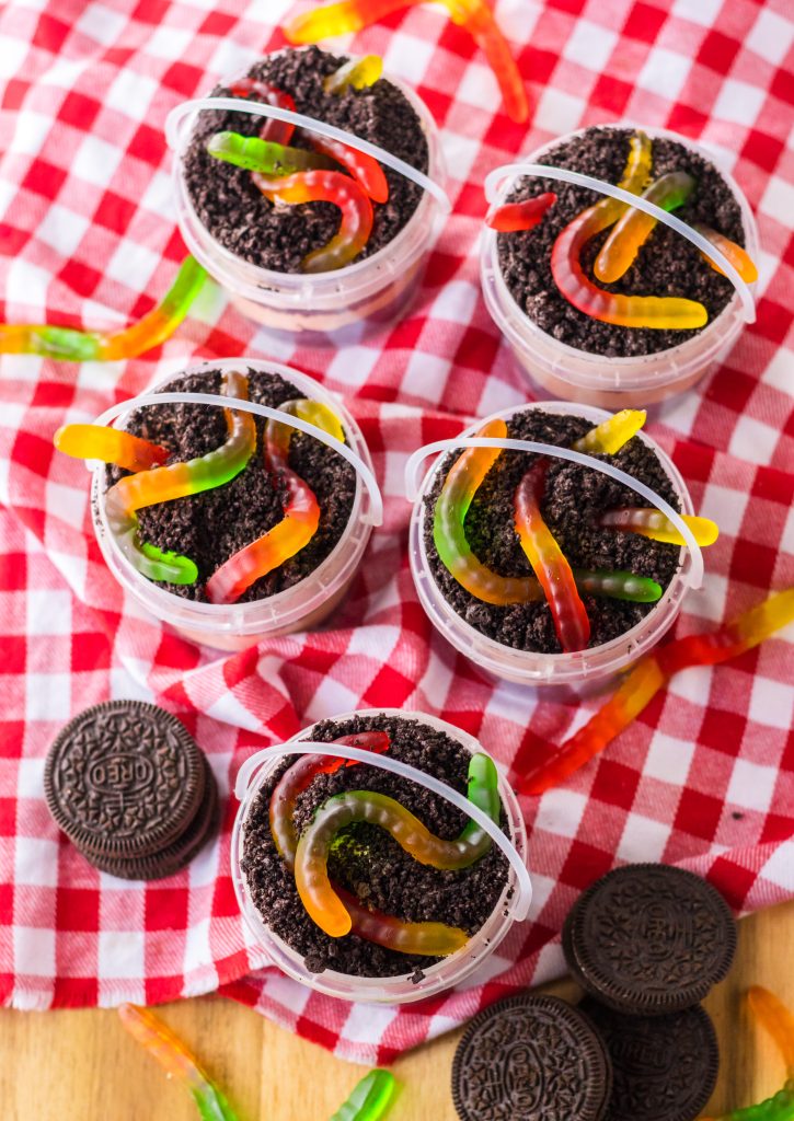 These adorable buckets layer crushed chocolate oreo cookies and a creamy layer of chocolate pudding mix. Then you top it with crushed up cookies to resemble the dirt. You just decorate it with gummi worms and you have a dessert every kid will love.