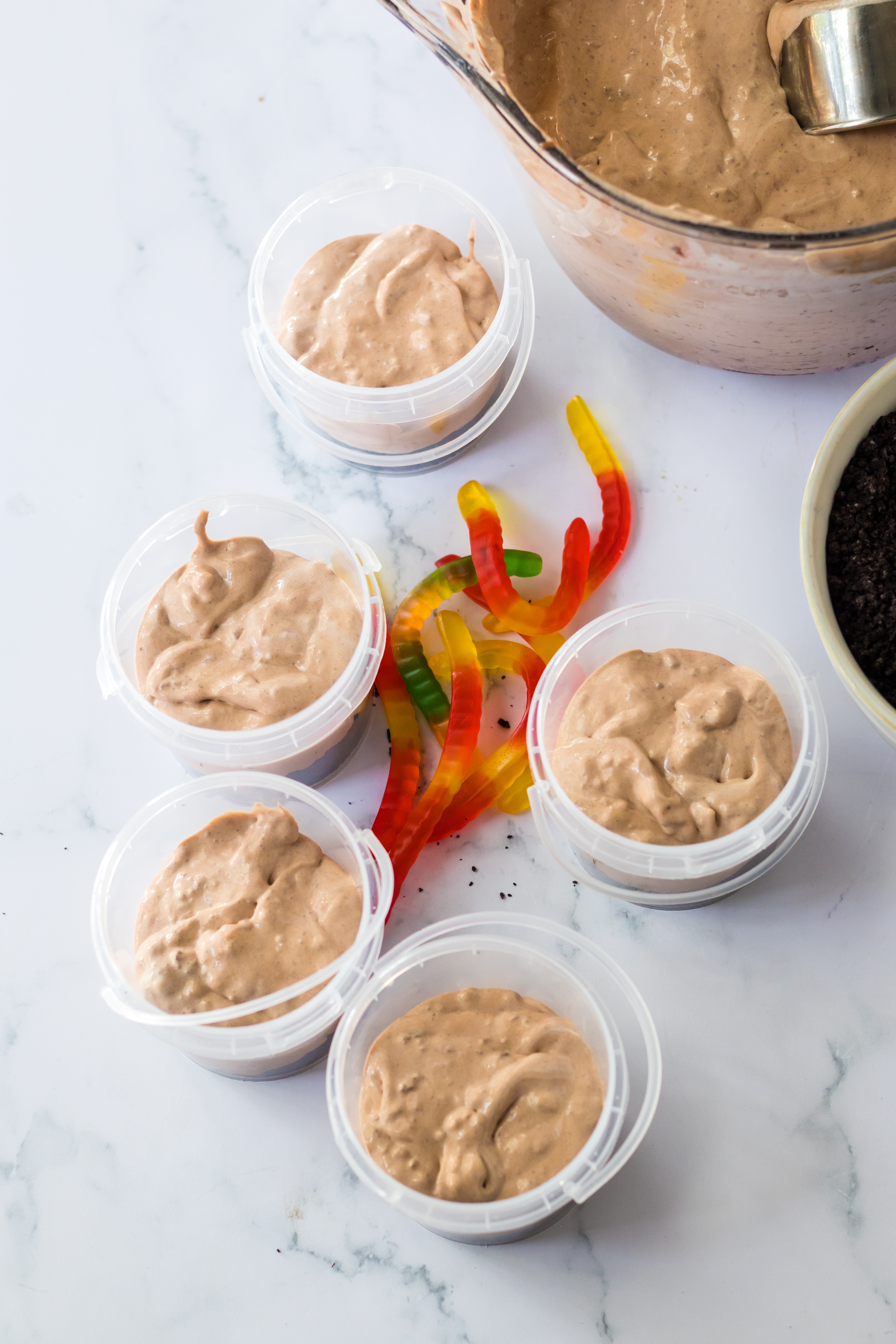 - Spoon some oreo crumbs down the bottom of each bucket.